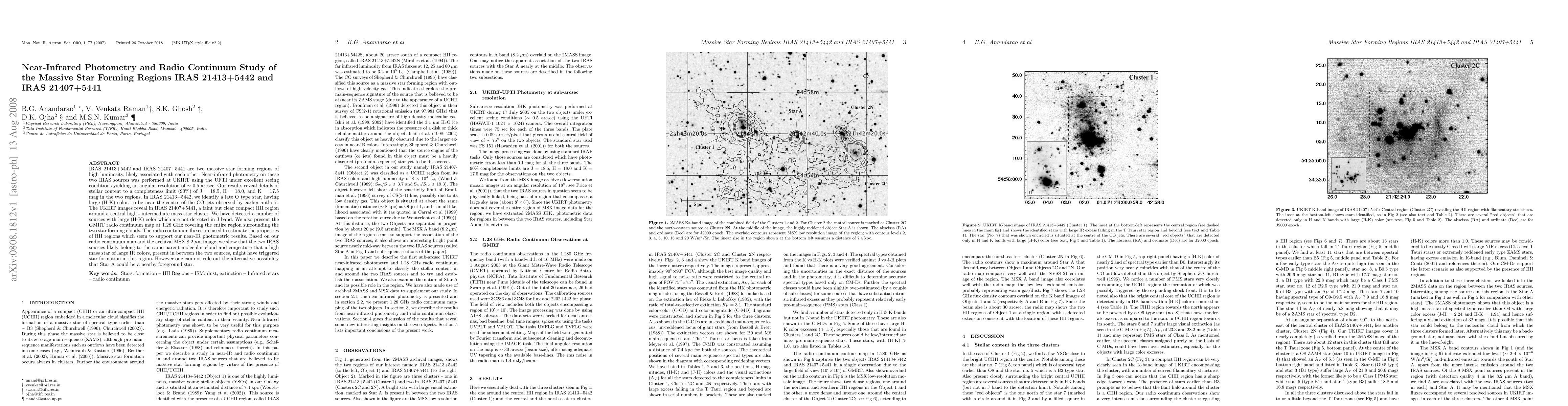 IRAS 21413+5442 and IRAS 21407+5441 are two massive star forming regions of high luminosity, likely associated with each other. Near-infrared photometry on these two IRAS sources was performed at UKIRT using the UFTI under excellent seeing conditions yielding an angular resolution of $\sim$ 0.5 arcsec. Our results reveal details of stellar content to a completeness limit (90%) of J = 18.5, H = 18.0, and K = 17.5 mag in the two regions. In IRAS 21413+5442, we identify a late O type star, having large (H-K) color, to be near the centre of the CO jets observed by earlier authors. The UKIRT images reveal in IRAS 21407+5441, a faint but clear compact HII region around a central high - intermediate mass star cluster. We have detected a number of sources with large (H-K) color which are not detected in J band. We also present the GMRT radio continuum map at 1.28 GHz covering the entire region surrounding the two star forming clouds. The radio continuum fluxes are used to estimate the properties of HII regions which seem to support our near-IR photometric results. Based on our radio continuum map and the archival MSX 8.2 $\mu$m image, we show that the two IRAS sources likely belong to the same parent molecular cloud and conjecture that a high mass star of large IR colors, present in between the two sources, might have triggered star formation in this region. However one can not rule out the alternative possibility that Star A could be a nearby foreground star.