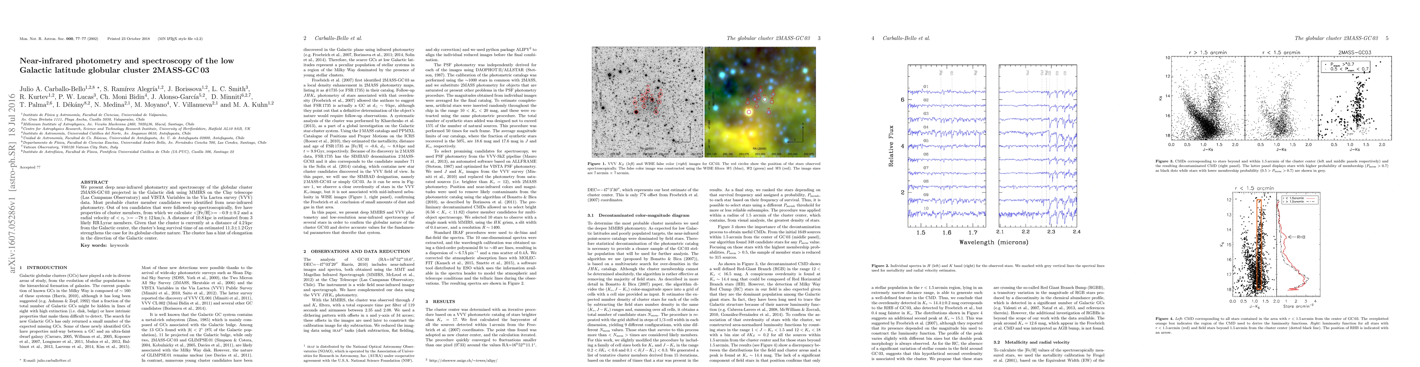 We present deep near-infrared photometry and spectroscopy of the globular cluster 2MASS-GC03 projected in the Galactic disk using MMIRS on the Clay telescope (Las Campanas Observatory) and VISTA Variables in the Via Lactea survey (VVV) data. Most probable cluster member candidates were identified from near-infrared photometry. Out of ten candidates that were followed-up spectroscopically, five have properties of cluster members, from which we calculate <[Fe/H]> = -0.9 +- 0.2 and a radial velocity of v_r > = -78 +- 12km/s. A distance of 10.8kpc is estimated from 3 likely RRLyrae members. Given that the cluster is currently at a distance of 4.2kpc from the Galactic center, the cluster's long survival time of an estimated 11.3 +- 1.2Gyr strengthens the case for its globular-cluster nature. The cluster has a hint of elongation in the direction of the Galactic center.