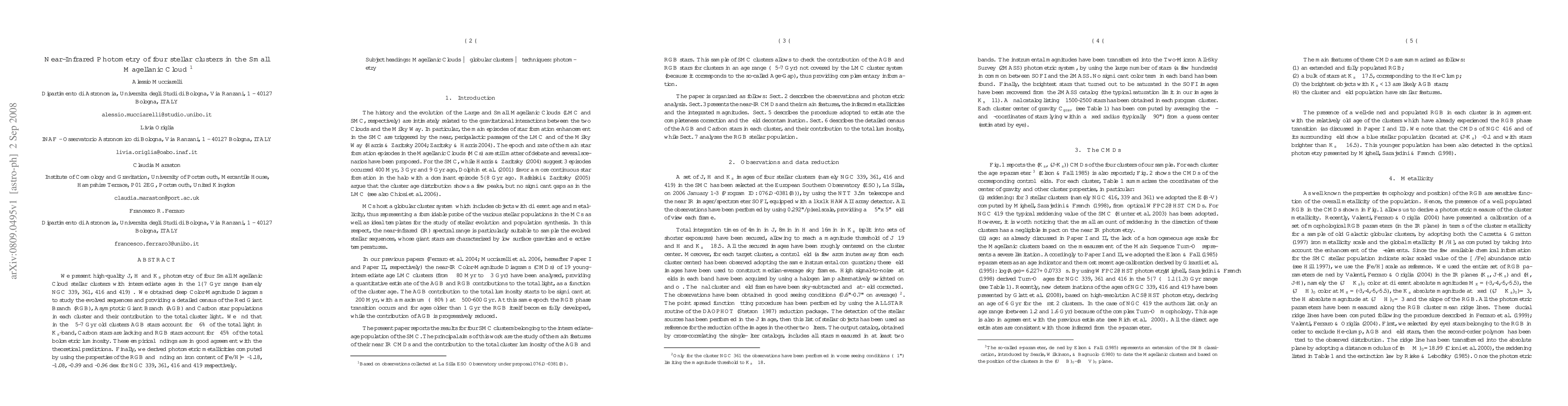 We present high-quality J, H and K photometry of four Small Magellanic Cloud stellar clusters with intermediate ages in the 1-7 Gyr range (namely NGC 339, 361, 416 and 419) . We obtained deep Color-Magnitude Diagrams to study the evolved sequences and providing a detailed census of the Red Giant Branch (RGB), Asymptotic Giant Branch (AGB) and Carbon star populations in each cluster and their contribution to the total cluster light. We find that in the 5-7 Gyr old clusters AGB stars account for ~6 % of the total light in K-band, Carbon stars are lacking and RGB stars account for ~45 % of the total bolometric luminosity. These empirical findings are in good agreement with the theoretical predictions. Finally, we derived photometric metallicities computed by using the properties of the RGB and finding an iron content of [Fe/H]=-1.18, -1.08, -0.99 and -0.96 dex for NGC 339, 361, 416 and 419 respectively.