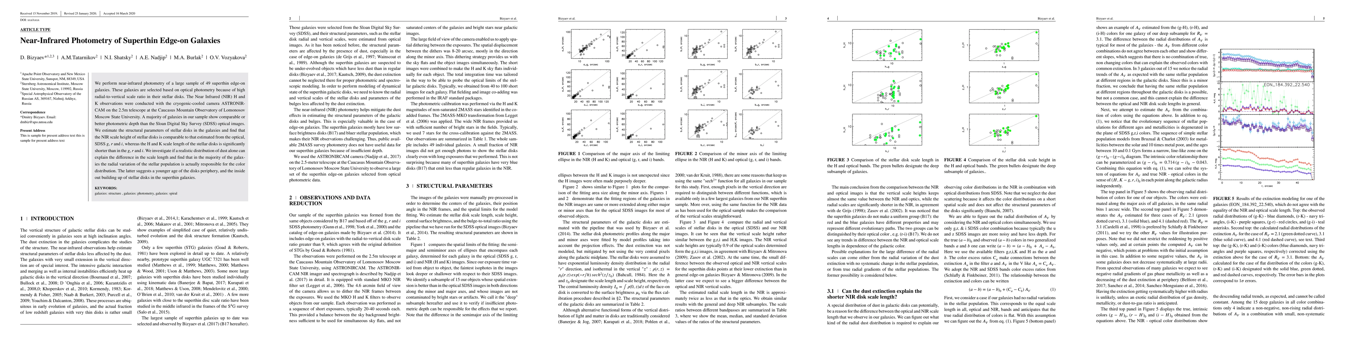 We perform near-infrared photometry of a large sample of 49 superthin edge-on galaxies. These galaxies are selected based on optical photometry because of high radial-to-vertical scale ratio in their stellar disks. The Near Infrared (NIR) H and K observations were conducted with the cryogenic-cooled camera ASTRONIRCAM on the 2.5m telescope at the Caucasus Mountain Observatory of Lomonosov Moscow State University. A majority of galaxies in our sample show comparable or better photometric depth than the Sloan Digital Sky Survey (SDSS) optical images. We estimate the structural parameters of stellar disks in the galaxies and find that the NIR scale height of stellar disks is comparable to that estimated from the optical, SDSS g, r and i, whereas the H and K scale length of the stellar disks is significantly shorter than in the g, r and i. We investigate if a realistic distribution of dust alone can explain the difference in the scale length and find that in the majority of the galaxies the radial variation of the stellar population is actually responsible for the color distribution. The latter suggests a younger age of the disks periphery, and the inside out building up of stellar disks in the superthin galaxies.