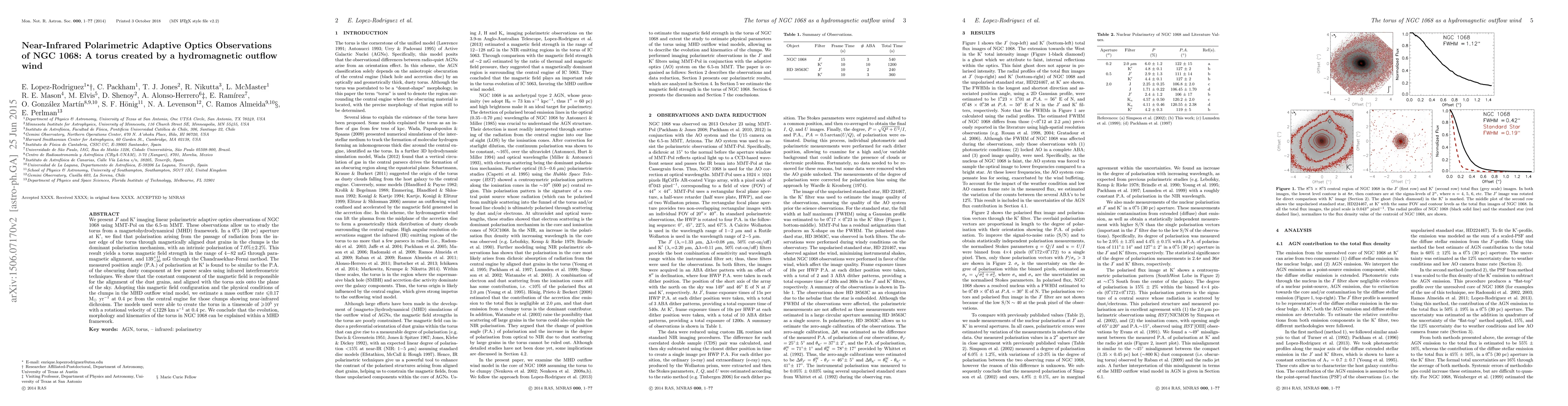 The research utilizes adaptive optics and polarimetry to study NGC 1068's torus, finding that magnetic field alignment with dust grains supports a hydromagnetic outflow wind model. The torus' magnetic field strength is estimated at 4-82 mG and 139±11-20 mG using different methods. The study suggests a mass outflow rate ≤0.17 M$_{odot}$ yr$^{-1}$ at 0.4 pc from the central engine, with torus evolution, morphology, and kinematics explained within a magnetohydrodynamical framework over ≥10$^{5}$ yr.