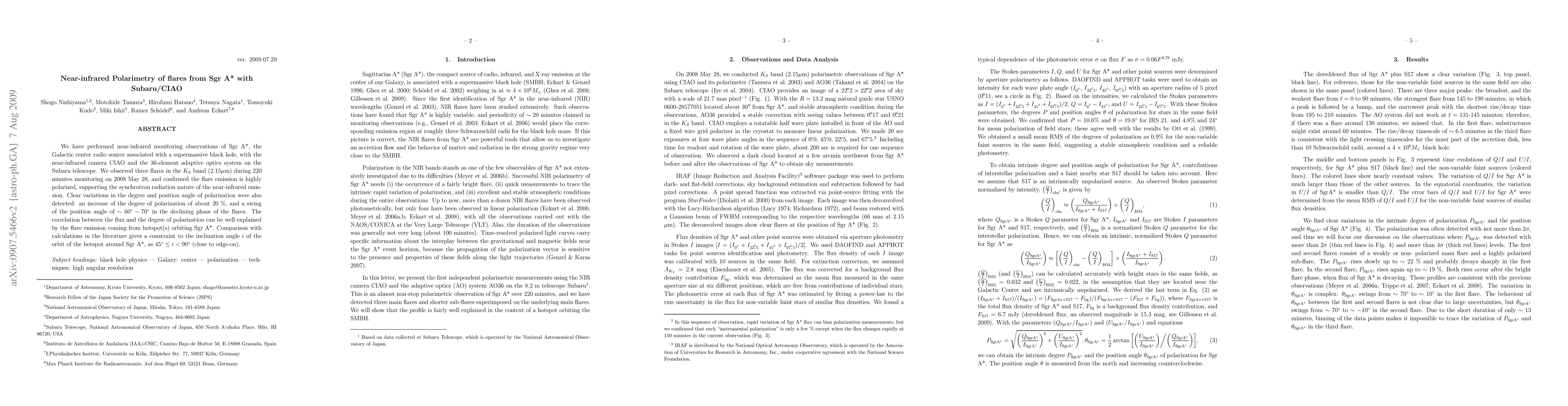 This study used near-infrared polarimetry with Subaru/CIAO to observe three flares from Sgr A*, confirming highly polarized synchrotron emission. The degree of polarization increased by about 20% and the position angle swung by 60-70 degrees, suggesting hotspot(s) orbiting Sgr A* and constraining the orbit inclination angle to 45 < i < 90 degrees.