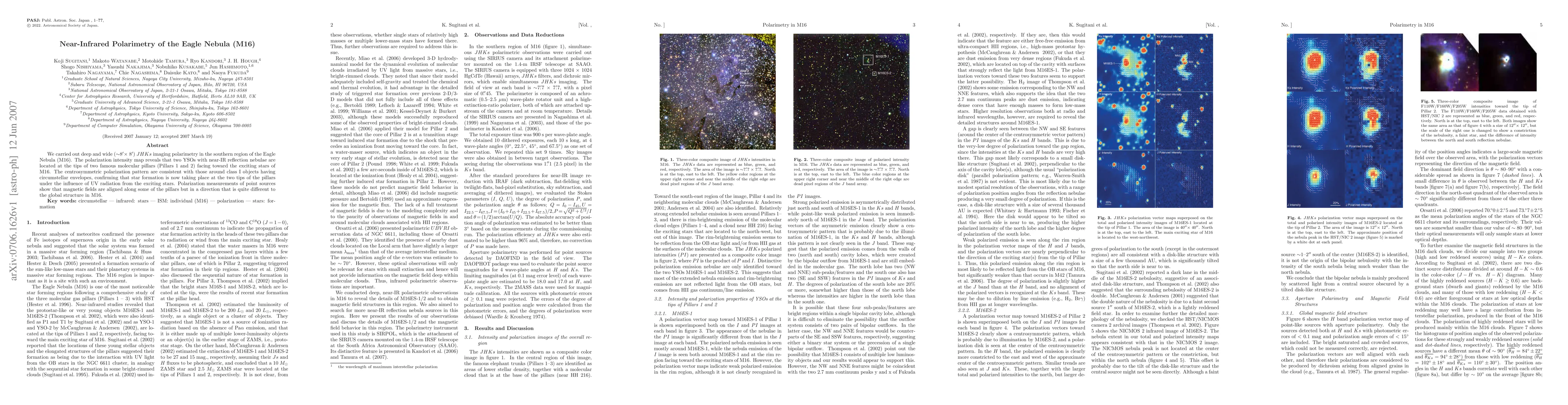 Researchers used near-infrared polarimetry to study the Eagle Nebula, finding two young stars forming at the tips of molecular pillars under UV radiation influence. Polarization patterns suggest alignment of magnetic fields along some pillars, indicating complex magnetic field dynamics in M16.