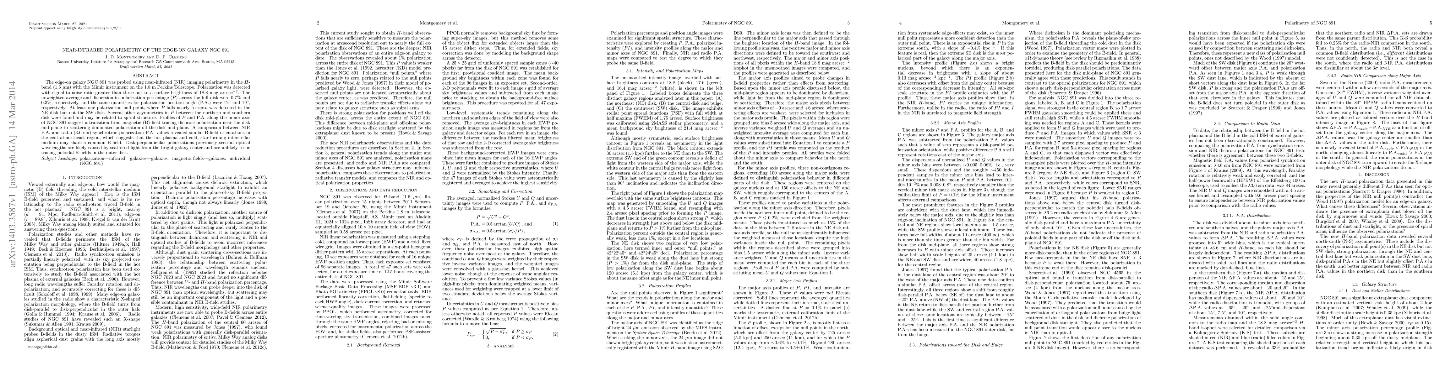 The edge-on galaxy NGC 891 was probed using near-infrared (NIR) imaging polarimetry in the H-band (1.6 um) with the Mimir instrument on the 1.8 m Perkins Telescope. Polarization was detected with signal-to-noise ratio greater than three out to a surface brightness of 18.8 mag arcsec^-2. The unweighted average and dispersion in polarization percentage (P) across the full disk were 0.7% and 0.3%, respectively, and the same quantities for polarization position angle (P.A.) were 12 deg and 19 deg, respectively. At least one polarization null point, where P falls nearly to zero, was detected in the NE disk but not the SW disk. Several other asymmetries in P between the northern and southern disk were found and may be related to spiral structure. Profiles of P and P.A. along the minor axis of NGC 891 suggest a transition from magnetic (B) field tracing dichroic polarization near the disk mid-plane to scattering dominated polarization off the disk mid-plane. A comparison between NIR P.A. and radio (3.6 cm) synchrotron polarization P.A. values revealed similar B-field orientations in the central-northeast region, which suggests that the hot plasma and cold, star-forming interstellar medium may share a common B-field. Disk-perpendicular polarizations previously seen at optical wavelengths are likely caused by scattered light from the bright galaxy center and are unlikely to be tracing poloidal B-fields in the outer disk.