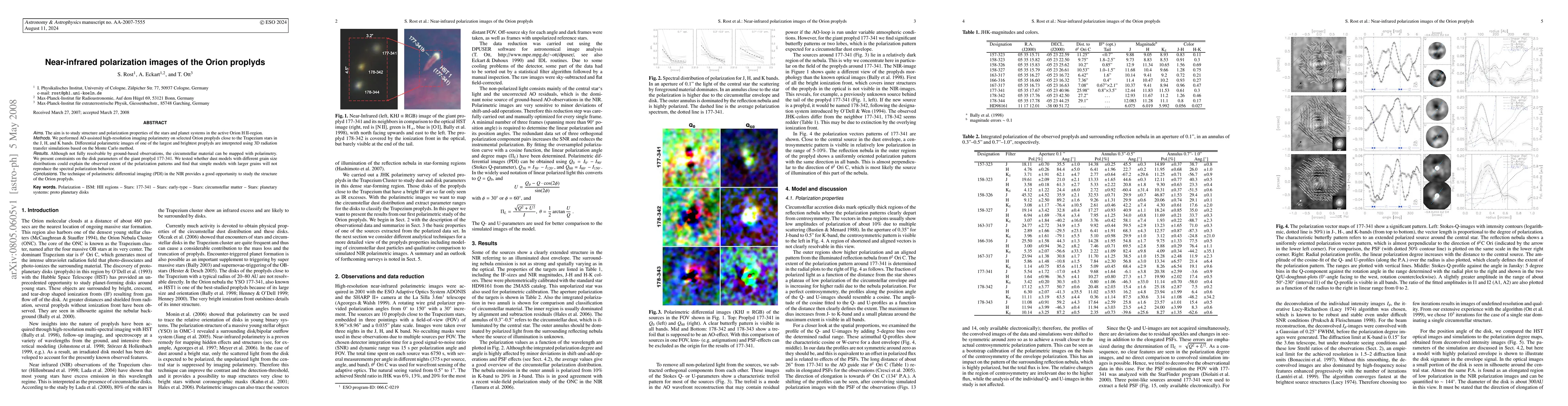 We performed AO-assisted high-resolution imaging polarimetry on selected Orion proplyds close to the Trapezium stars in the J, H, and K bands. Differential polarimetric images of one of the largest and brightest proplyds are interpreted using 3D radiation transfer simulations based on the Monte Carlo method. Although not fully resolvable by ground-based observations, the circumstellar material can be mapped with polarimetry. We present constraints on the disk parameters of the giant proplyd 177-341. We tested whether dust models with different grain size distributions could explain the observed extent of the polarization patterns and find that simple models with larger grains will not reproduce the spectral polarization behavior. The technique of polarimetric differential imaging (PDI) in the NIR provides a good opportunity to study the structure of the Orion proplyds.