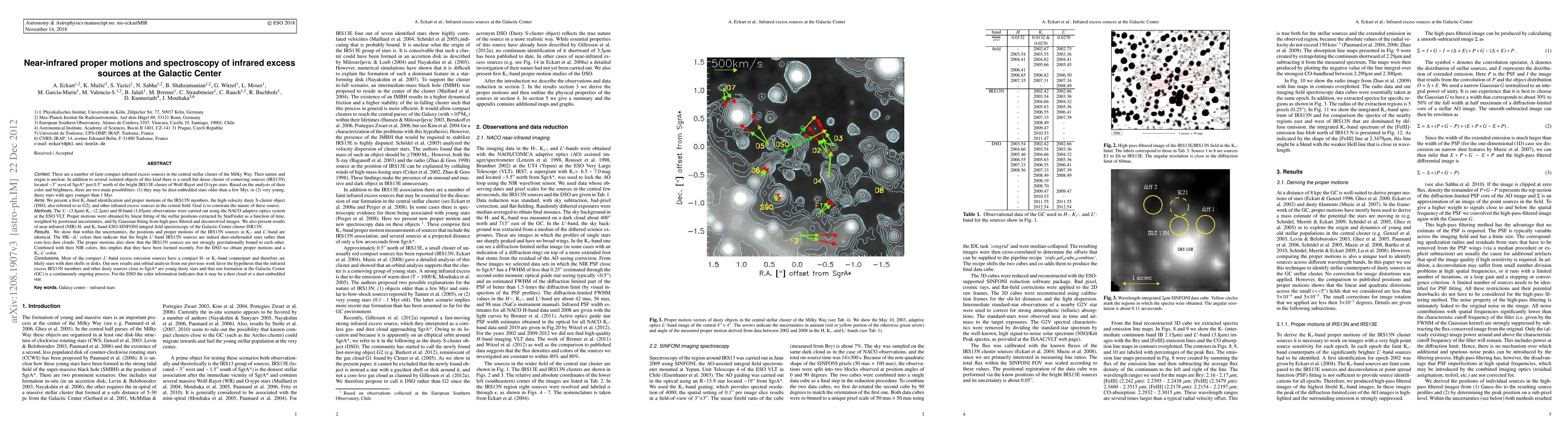 There are a number of faint compact infrared excess sources in the central stellar cluster of the Milky Way. Their nature and origin is unclear. In addition to several isolated objects of this kind we find a small but dense cluster of co-moving sources (IRS13N) about 3" west of SgrA* just 0.5" north of the bright IRS13E cluster of WR and O-type stars. Based on their color and brightness, there are two main possibilities: (1) they may be dust embedded stars older than few Myr, or (2) extremely young, dusty stars with ages less than 1Myr. We present fist H- and Ks-band identifications or proper motions of the IRS13N members, the high velocity dusty S-cluster object (DSO), and other infrared excess sources in the central field. We also present results of NIR H- and Ks-band ESO-SINFONI integral field spectroscopy of ISR13N. We show that within the uncertainties, the proper motions of the IRS13N sources in Ks- and L'-band are identical. This indicates that the bright L'-band IRS13N sources are indeed dust enshrouded stars rather than core-less dust clouds. The proper motions show that the IRS13N sources are not strongly gravitationally bound to each other implying that they have been formed recently. We also present a first H- and Ks-band identification as well as proper motions and HKsL'-colors of a fast moving DSO which was recently found in the cluster of high speed S-stars that surround the super-massive black hole Sagittarius A* (SgrA*). Most of the compact L'-band excess emission sources have a compact H- or Ks-band counterpart and therefore are likely stars with dust shells or disks. Our new results and orbital analysis from our previous work favor the hypothesis that the infrared excess IRS13N members and other dusty sources close to SgrA* are very young dusty stars and that star formation at the GC is a continuously ongoing process.
