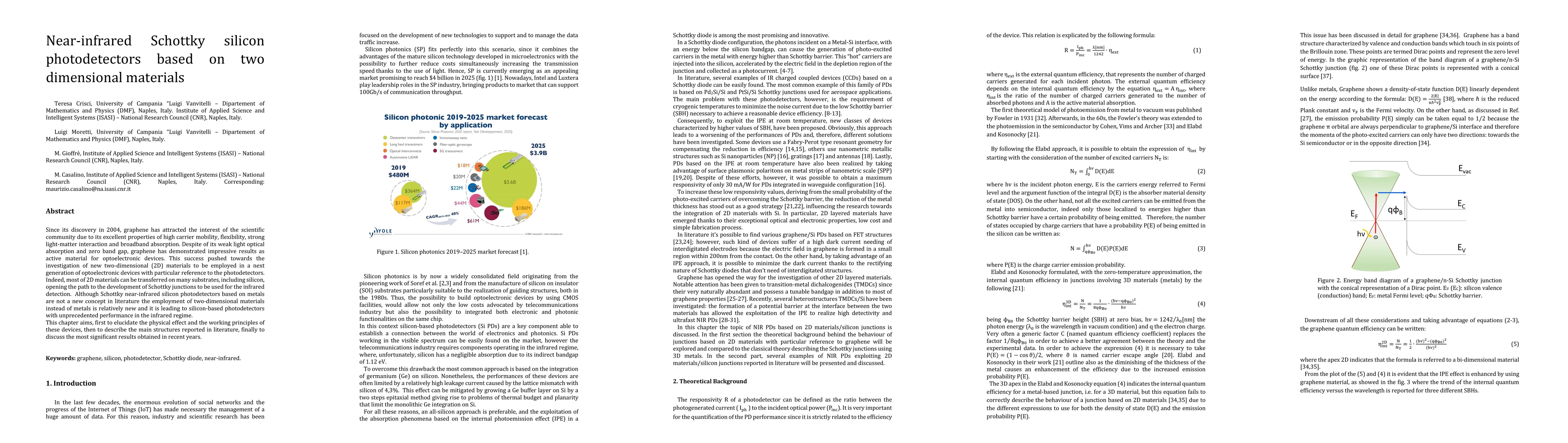Since its discovery in 2004, graphene has attracted the interest of the scientific community due to its excellent properties of high carrier mobility, flexibility, strong light-matter interaction and broadband absorption. Despite of its weak light optical absorption and zero band gap, graphene has demonstrated impressive results as active material for optoelectronic devices. This success pushed towards the investigation of new two-dimensional (2D) materials to be employed in a next generation of optoelectronic devices with particular reference to the photodetectors. Indeed, most of 2D materials can be transferred on many substrates, including silicon, opening the path to the development of Schottky junctions to be used for the infrared detection. Although Schottky near-infrared silicon photodetectors based on metals are not a new concept in literature the employment of two-dimensional materials instead of metals is relatively new and it is leading to silicon-based photodetectors with unprecedented performance in the infrared regime. This chapter aims, first to elucidate the physical effect and the working principles of these devices, then to describe the main structures reported in literature, finally to discuss the most significant results obtained in recent years.