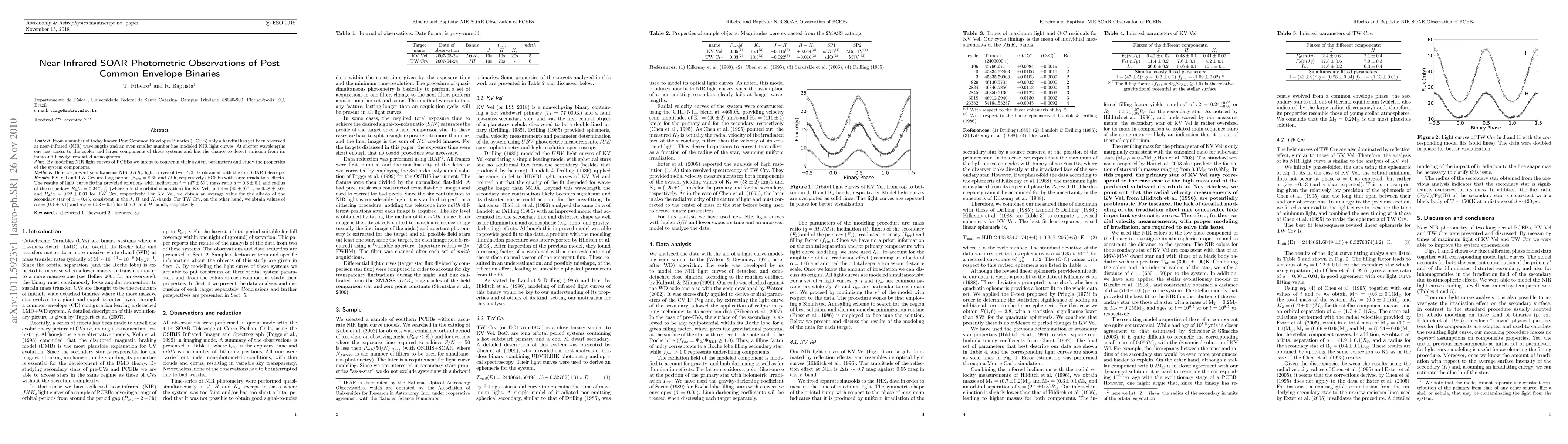 {From a number of today known Post Common Envelopes Binaries (PCEB) only a handful has yet been observed at near-infrared (NIR) wavelengths and an even smaller number has modeled NIR light curves. At shorter wavelengths one has access to the cooler and larger components of these systems and has the chance to detect emission from its faint and heavily irradiated atmospheres. } {By modeling NIR light curves of PCEBs we intent to constrain their system parameters and study the properties of the system components.} {Here we present simultaneous NIR $JHK_s$ light curves of two PCEBs obtained with the $4m$ SOAR telescope.} {%For this work we have selected 3 systems from a previously selected sample of 8 PCEBs. KV Vel and TW Crv are long period (P$_{\rm orb} =$ 8.6h and 7.9h, respectively) PCEBs with large irradiation effects. The results of light curve fitting provided solutions with inclination $i = (47\pm5)^\circ$, mass ratio $q = 0.3\pm0.1$ and radius of the secondary $R_2/a = 0.24^{+0.05}_{-0.03}$ (where $a$ is the orbital separation) for KV Vel, and $i = (42\pm9)\degr$, $q = 0.28\pm0.04$ and $R_2/a = 0.22\pm0.01$ for TW Crv, respectively. For KV Vel, we obtain an average value for the albedo of the secondary star of $\alpha = 0.43$, consistent in the $J$, $H$ and $K_s$-bands. For TW Crv, on the other hand, we obtain values of $\alpha_{J} = (0.4\pm0.1)$ and $\alpha_{H} = (0.3\pm0.1)$ for the $J$- and $H$-bands, respectively.