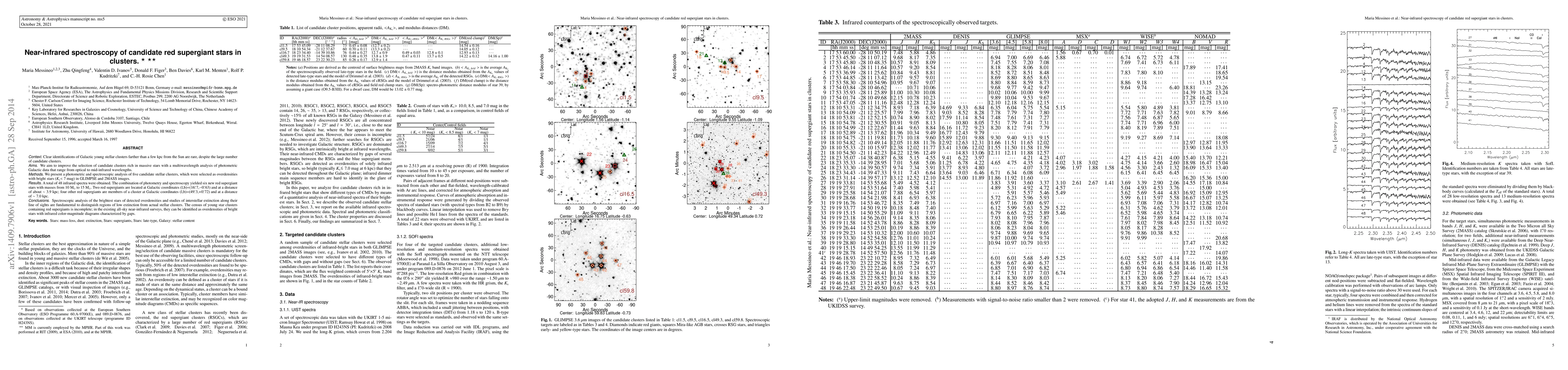 Clear identifications of Galactic young stellar clusters farther than a few kpc from the Sun are rare, despite the large number of candidate clusters. We aim to improve the selection of candidate clusters rich in massive stars with a multiwavelength analysis of photometric Galactic data that range from optical to mid-infrared wavelengths. We present a photometric and spectroscopic analysis of five candidate stellar clusters, which were selected as overdensities with bright stars (Ks < 7 mag) in GLIMPSE and 2MASS images. A total of 48 infrared spectra were obtained. The combination of photometry and spectroscopy yielded six new red supergiant stars with masses from 10 Msun to 15 Msun. Two red supergiants are located at Galactic coordinates (l,b)=(16.7deg,-0.63deg) and at a distance of about ~3.9 kpc; four other red supergiants are members of a cluster at Galactic coordinates (l,b)=(49.3deg,+0.72deg) and at a distance of ~7.0 kpc. Spectroscopic analysis of the brightest stars of detected overdensities and studies of interstellar extinction along their line of sights are fundamental to distinguish regions of low extinction from actual stellar clusters. The census of young star clusters containing red supergiants is incomplete; in the existing all-sky near-infrared surveys, they can be identified as overdensities of bright stars with infrared color-magnitude diagrams characterized by gaps.