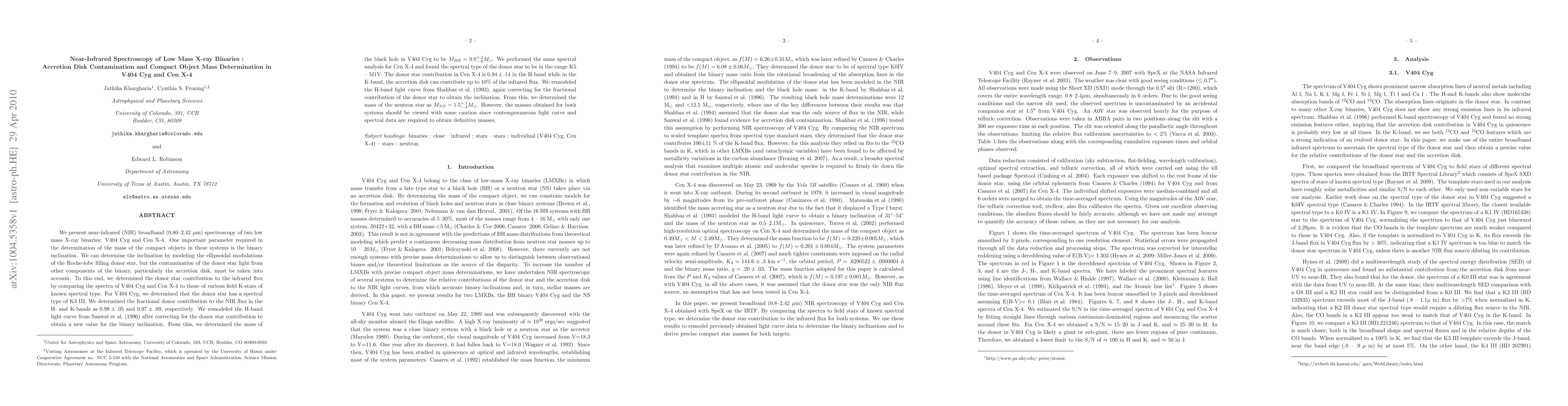 Researchers used near-infrared spectroscopy to study two low-mass X-ray binaries, determining the mass of a black hole in V404 Cyg as 9.0 solar masses and a neutron star in Cen X-4 as 1.5 solar masses with some caution due to limitations in data.