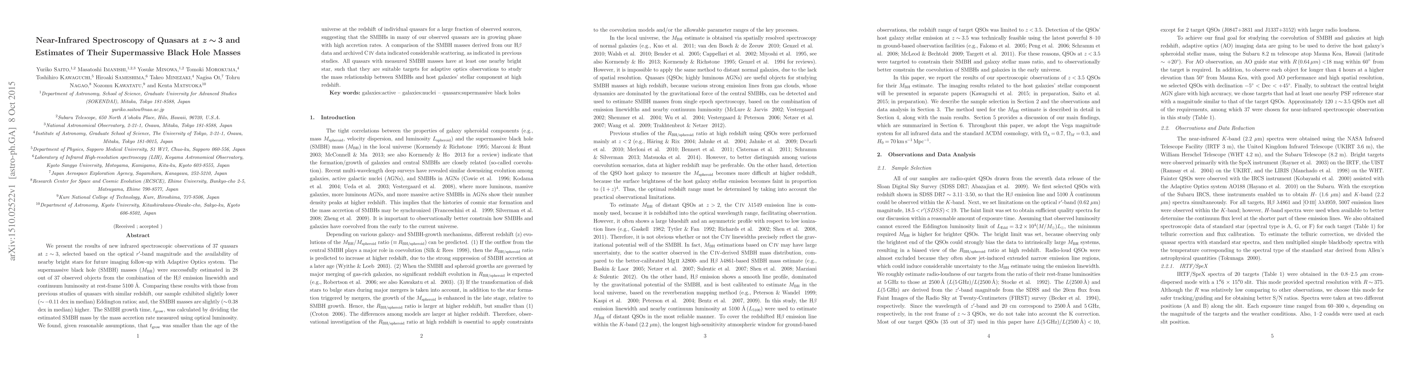 We present the results of new infrared spectroscopic observations of 37 quasars at z~3, selected based on the optical r'-band magnitude and the availability of nearby bright stars for future imaging follow-up with Adaptive Optics system. The supermassive black hole (SMBH) masses (M_BH) were successfully estimated in 28 out of 37 observed objects from the combination of the H_beta emission linewidth and continuum luminosity at rest-frame 5100A. Comparing these results with those from previous studies of quasars with similar redshift, our sample exhibited slightly lower (~ -0.11 dex in median) Eddington ratios; and, the SMBH masses are slightly (~ 0.38 dex in median) higher. The SMBH growth time, t_grow, was calculated by dividing the estimated SMBH mass by the mass accretion rate measured using optical luminosity. We found, given reasonable assumptions, that t_grow was smaller than the age of the universe at the redshift of individual quasars for a large fraction of observed sources, suggesting that the SMBHs in many of our observed quasars are in growing phase with high accretion rates. A comparison of the SMBH masses derived from our H_beta data and archived CIV data indicated considerable scattering, as indicated in previous studies. All quasars with measured SMBH masses have at least one nearby bright star, such that they are suitable targets for adaptive optics observations to study the mass relationship between SMBHs and host galaxies' stellar component at high redshift.