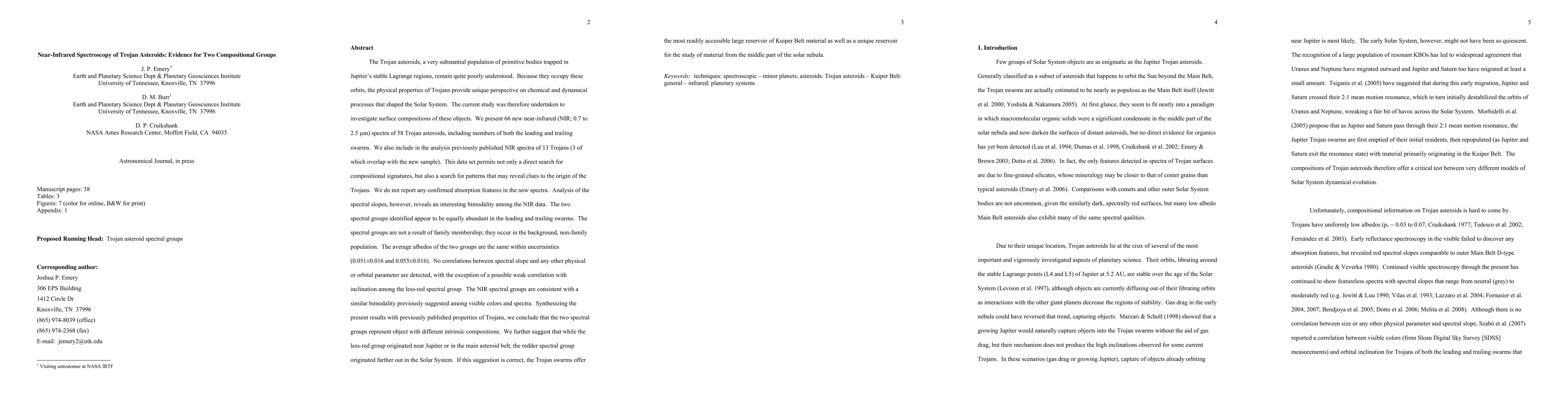 This study presents new near-infrared spectra of Trojan asteroids, revealing a bimodal distribution in spectral slopes indicative of two distinct compositional groups. These groups suggest different origins, with the less-red group possibly originating near Jupiter and the redder group from farther out in the Solar System.