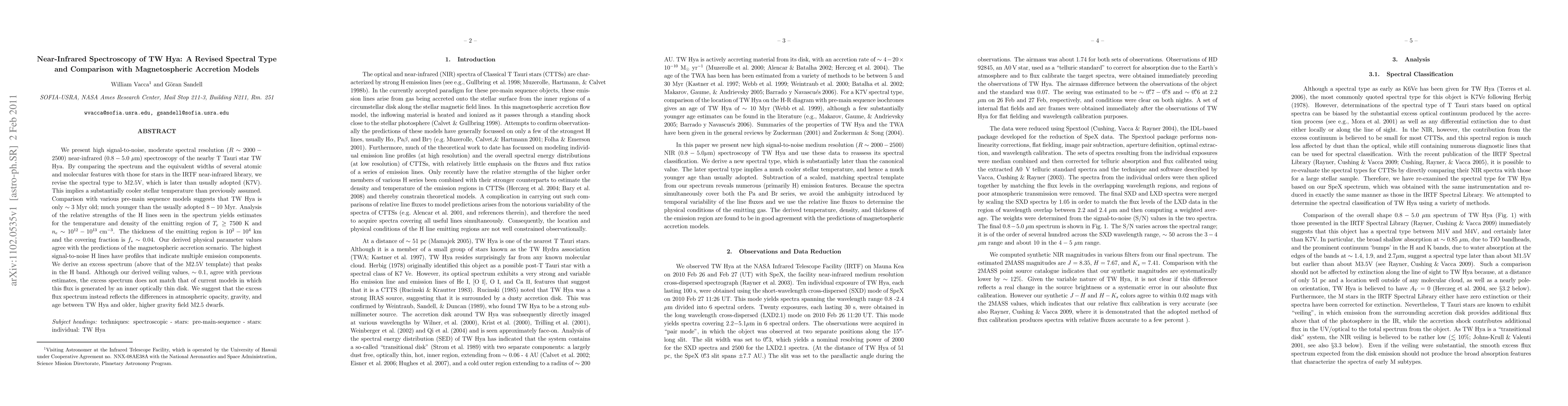 We present high signal-to-noise, moderate spectral resolution (R ~ 2000-2500) near-infrared (0.8-5.0 micron) spectroscopy of the nearby T Tauri star TW Hya. By comparing the spectrum and the equivalent widths of several atomic and molecular features with those for stars in the IRTF near-infrared library, we revise the spectral type to M2.5V, which is later than usually adopted (K7V). This implies a substantially cooler stellar temperature than previously assumed. Comparison with various pre-main sequence models suggests that TW Hya is only ~3 Myr old; much younger than the usually adopted 8 - 10 Myr. Analysis of the relative strengths of the H lines seen in the spectrum yields estimates for the temperature and density of the emitting region of T_e > 7500 K and n_e ~ 10^{12} - 10^{13} cm^{-3}. The thickness of the emitting region is 10^2 - 10^4 km and the covering fraction is f_\ast ~ 0.04. Our derived physical parameter values agree with the predictions of the magnetospheric accretion scenario. The highest signal-to-noise H lines have profiles that indicate multiple emission components. We derive an excess spectrum (above that of the M2.5V template) that peaks in the H band. Although our derived veiling values, ~ 0.1, agree with previous estimates, the excess spectrum does not match that of current models in which this flux is generated by an inner optically thin disk. We suggest that the excess flux spectrum instead reflects the differences in atmospheric opacity, gravity, and age between TW Hya and older, higher gravity field M2.5 dwarfs.