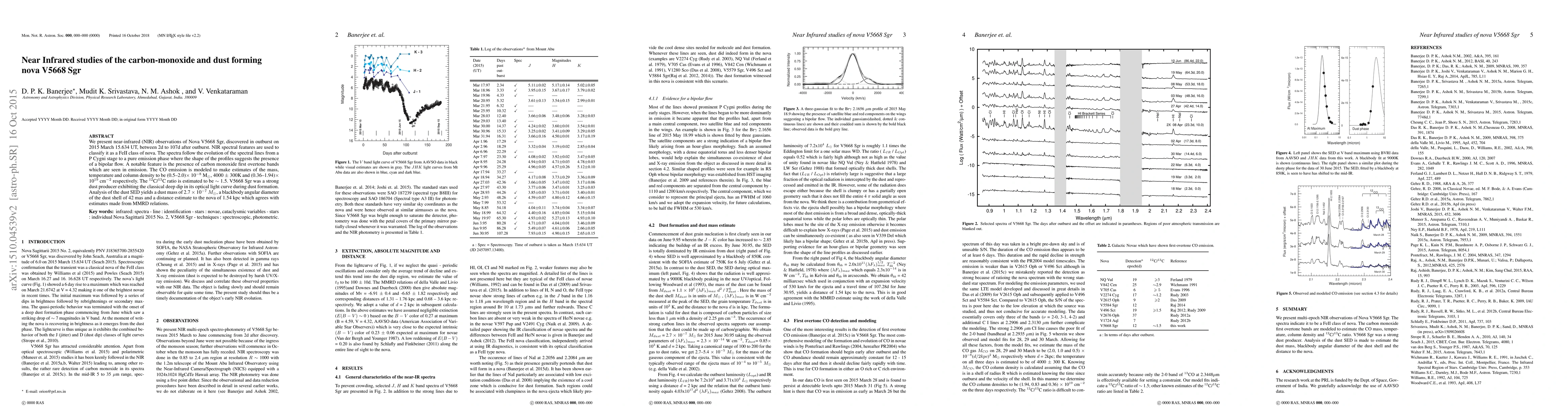 We present near-infrared (NIR) observations of Nova V5668 Sgr, discovered in outburst on 2015 March 15.634 UT, between 2d to 107d after outburst. NIR spectral features are used to classify it as a FeII class of nova. The spectra follow the evolution of the spectral lines from a P Cygni stage to a pure emission phase where the shape of the profiles suggests the presence of a bipolar flow. A notable feature is the presence of carbon monoxide first overtone bands which are seen in emission. The CO emission is modeled to make estimates of the mass, temperature and column density to be (0.5--2.0)$\times$ 10$^{-8}$ M$_\odot$, 4000 $\pm$ 300K and (0.36--1.94)$\times$ 10$^{19}$ cm$^{-2}$ respectively. The $^{12}$C/$^{13}$C ratio is estimated to be $\sim$ 1.5. V5668 Sgr was a strong dust producer exhibiting the classical deep dip in its optical light curve during dust formation. Analysis of the dust SED yields a dust mass of 2.7 $\times$ 10${^{\rm -7}}$ $M_\odot $, a blackbody angular diameter of the dust shell of 42 mas and a distance estimate to the nova of 1.54 kpc which agrees with estimates made from MMRD relations.
