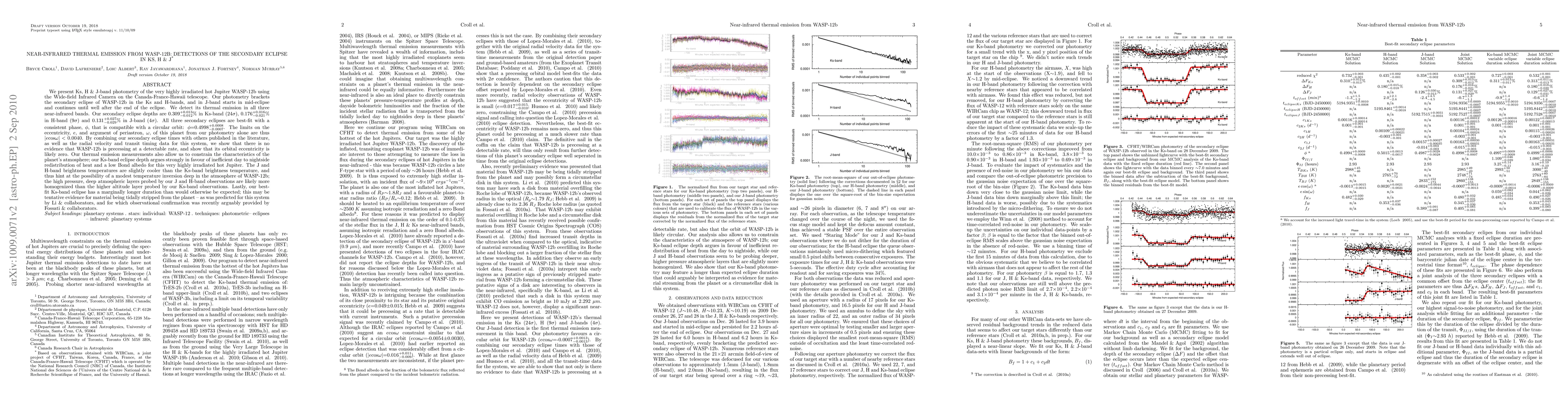 We present Ks, H & J-band photometry of the very highly irradiated hot Jupiter WASP-12b using the Wide-field Infrared Camera on the Canada-France-Hawaii telescope. Our photometry brackets the secondary eclipse of WASP-12b in the Ks and H-bands, and in J-band starts in mid-eclipse and continues until well after the end of the eclipse. We detect its thermal emission in all three near-infrared bands. Our secondary eclipse depths are 0.309 +/- 0.013% in Ks-band (24-sigma), 0.176 +/- 0.020% in H-band (9-sigma) and 0.131 +/- 0.028% in J-band (4-sigma). All three secondary eclipses are best-fit with a consistent phase that is compatible with a circular orbit. By combining our secondary eclipse times with others published in the literature, as well as the radial velocity and transit timing data for this system, we show that there is no evidence that WASP-12b is precessing at a detectable rate, and show that its orbital eccentricity is likely zero. Our thermal emission measurements also allow us to constrain the characteristics of the planet's atmosphere; our Ks-band eclipse depth argues in favour of inefficient day to nightside redistribution of heat and a low Bond albedo for this very highly irradiated hot Jupiter. The J and H-band brightness temperatures are slightly cooler than the Ks-band brightness temperature, and thus hint at the possibility of a modest temperature inversion deep in the atmosphere of WASP-12b; the high pressure, deep atmospheric layers probed by our J and H-band observations are likely more homogenized than the higher altitude layer. Lastly, our best-fit Ks-band eclipse has a marginally longer duration than would otherwise be expected; this may be tentative evidence for material being tidally stripped from the planet - as was predicted for this system by Li & collaborators, and for which observational confirmation was recently arguably provided by Fossati & collaborators.