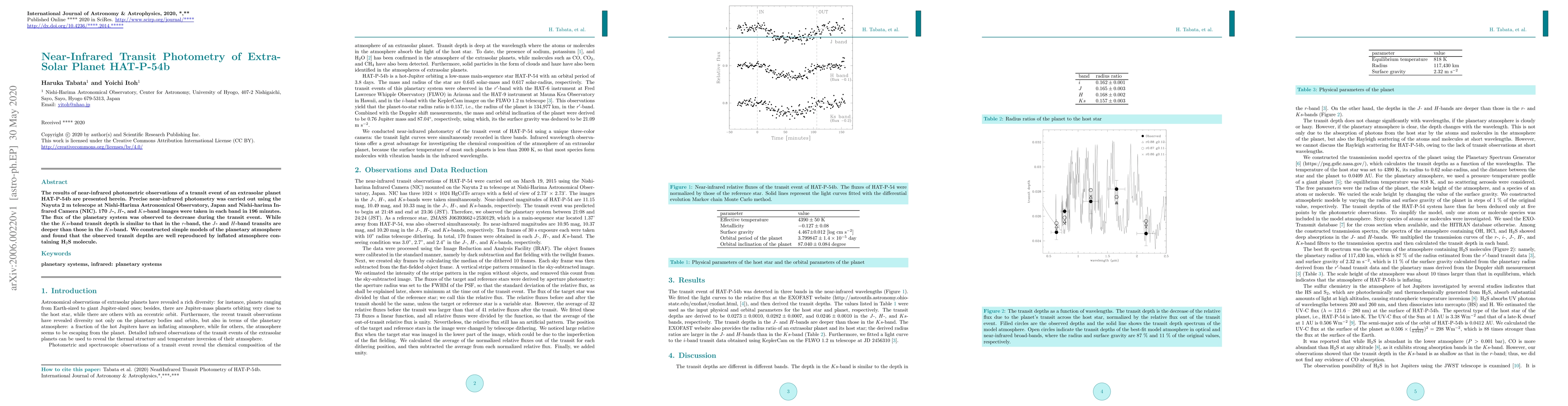 This study uses near-infrared photometry to observe an extrasolar planet HAT-P-54b during a transit event, finding the Ks-band transit depth is similar to that in r-band, while J- and H-band transits are deeper. The observed transit depths are well-reproduced by models of an inflated atmosphere containing H2S molecules.