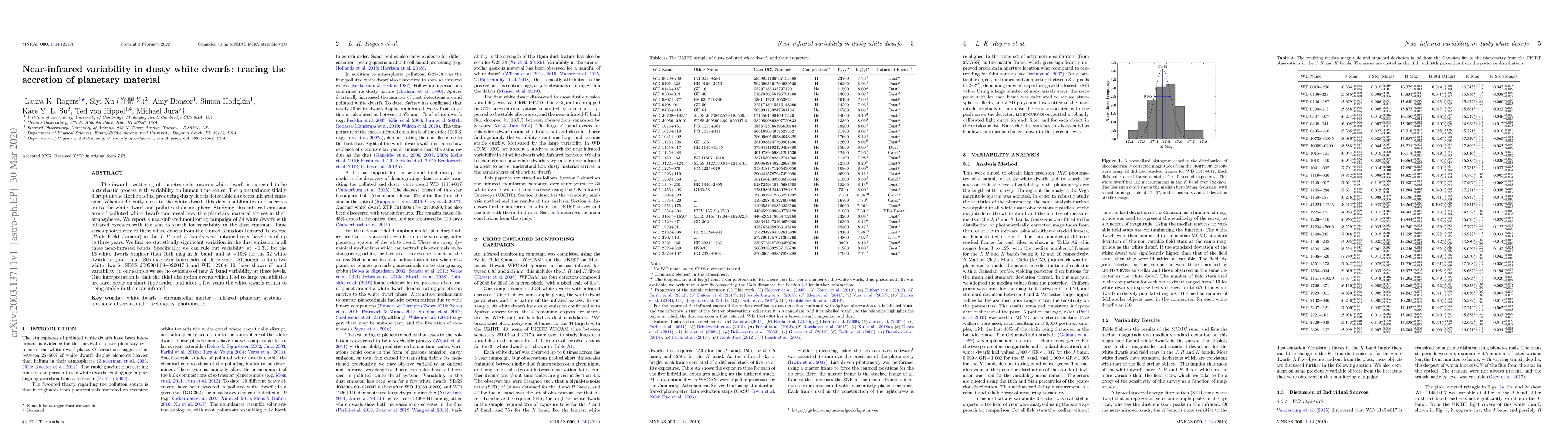 The inwards scattering of planetesimals towards white dwarfs is expected to be a stochastic process with variability on human time-scales. The planetesimals tidally disrupt at the Roche radius, producing dusty debris detectable as excess infrared emission. When sufficiently close to the white dwarf, this debris sublimates and accretes on to the white dwarf and pollutes its atmosphere. Studying this infrared emission around polluted white dwarfs can reveal how this planetary material arrives in their atmospheres. We report a near-infrared monitoring campaign of 34 white dwarfs with infrared excesses with the aim to search for variability in the dust emission. Time series photometry of these white dwarfs from the United Kingdom Infrared Telescope (Wide Field Camera) in the J, H and K bands were obtained over baselines of up to three years. We find no statistically significant variation in the dust emission in all three near-infrared bands. Specifically, we can rule out variability at ~1.3% for the 13 white dwarfs brighter than 16th mag in K band, and at ~10% for the 32 white dwarfs brighter than 18th mag over time-scales of three years. Although to date two white dwarfs, SDSS J095904.69-020047.6 and WD 1226+110, have shown K band variability, in our sample we see no evidence of new K band variability at these levels. One interpretation is that the tidal disruption events which lead to large variabilities are rare, occur on short time-scales, and after a few years the white dwarfs return to being stable in the near-infrared.