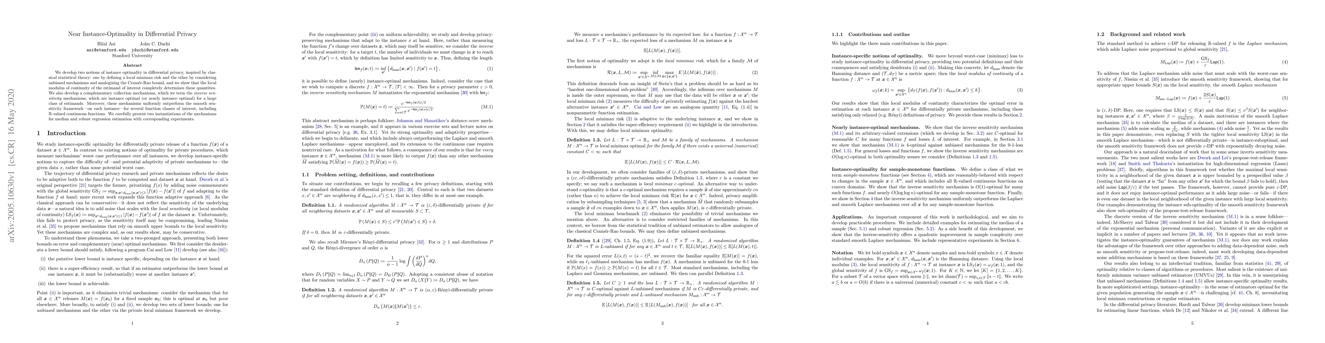This paper introduces two notions of instance optimality in differential privacy, demonstrating that the local modulus of continuity determines these measures. It proposes inverse sensitivity mechanisms that nearly achieve instance optimality for a wide range of estimands, outperforming the smooth sensitivity framework, and presents applications for median and robust regression estimation.