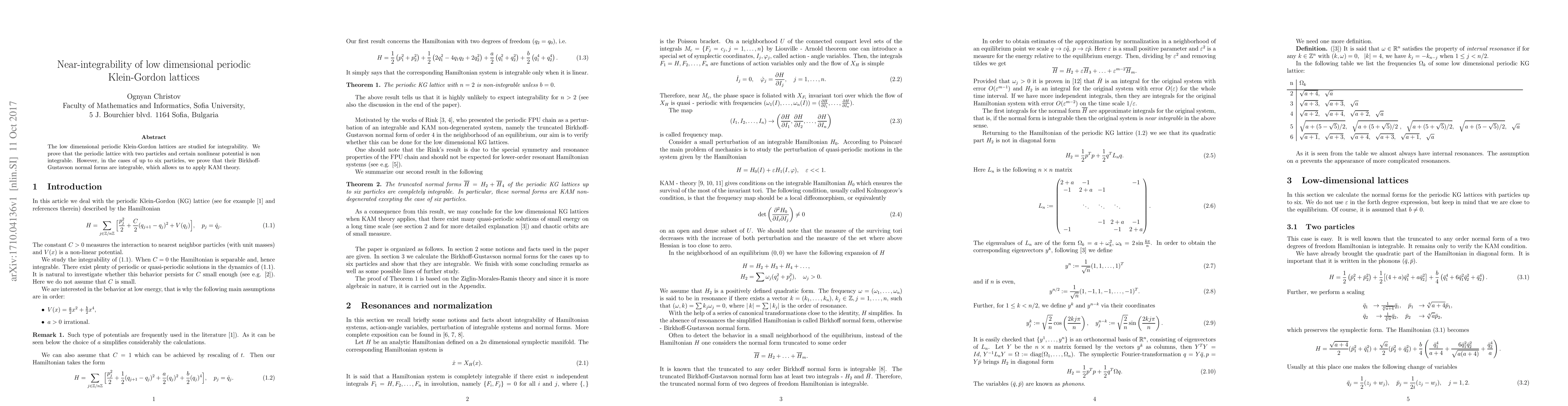 Research shows that up to six-particle Klein-Gordon lattices with certain nonlinear potentials can be integrated using Birkhoff-Gustavson normal forms, allowing the application of KAM theory. In contrast, a two-particle lattice is found to be non-integrable.