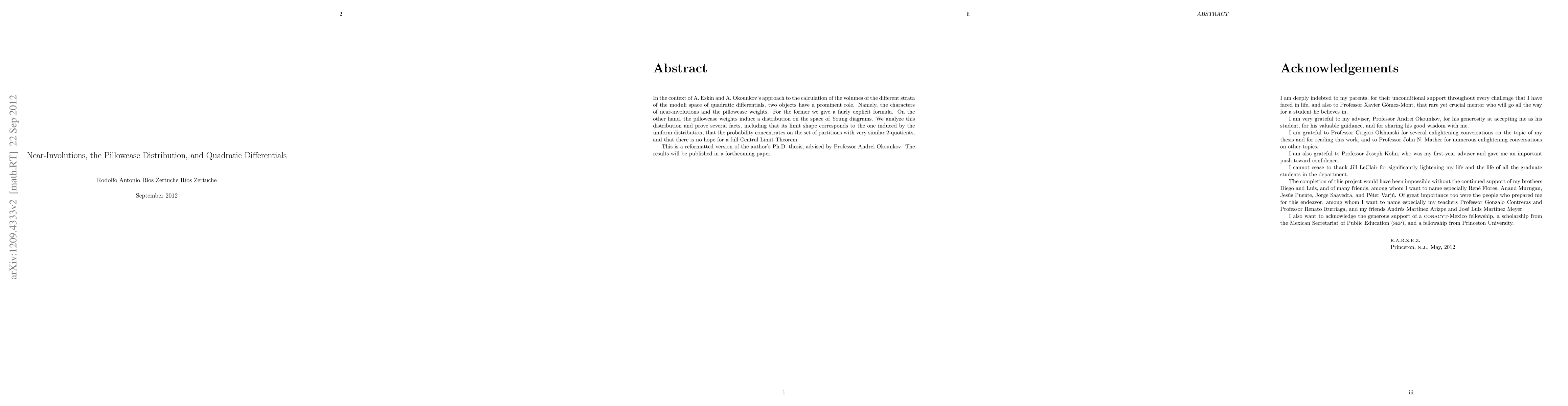 This paper explores the calculation of volumes in the moduli space of quadratic differentials, focusing on near-involutions and pillowcase weights. It provides an explicit formula for near-involution characters and analyzes the distribution induced by pillowcase weights on Young diagrams, revealing concentration on partitions with similar 2-quotients and a lack of a full Central Limit Theorem.