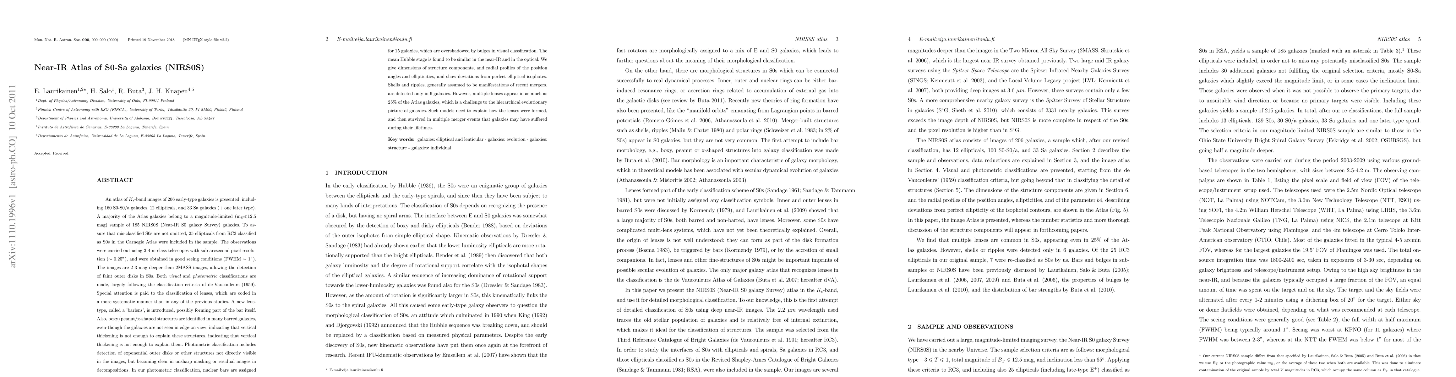 This paper presents an atlas of Ks-band near-infrared images of 206 early-type galaxies, including 160 S0-S0/a galaxies, 12 ellipticals, and 33 Sa galaxies. The study challenges the hierarchical galaxy model by identifying multiple lenses in 25% of galaxies, suggesting complex formation and survival mechanisms.