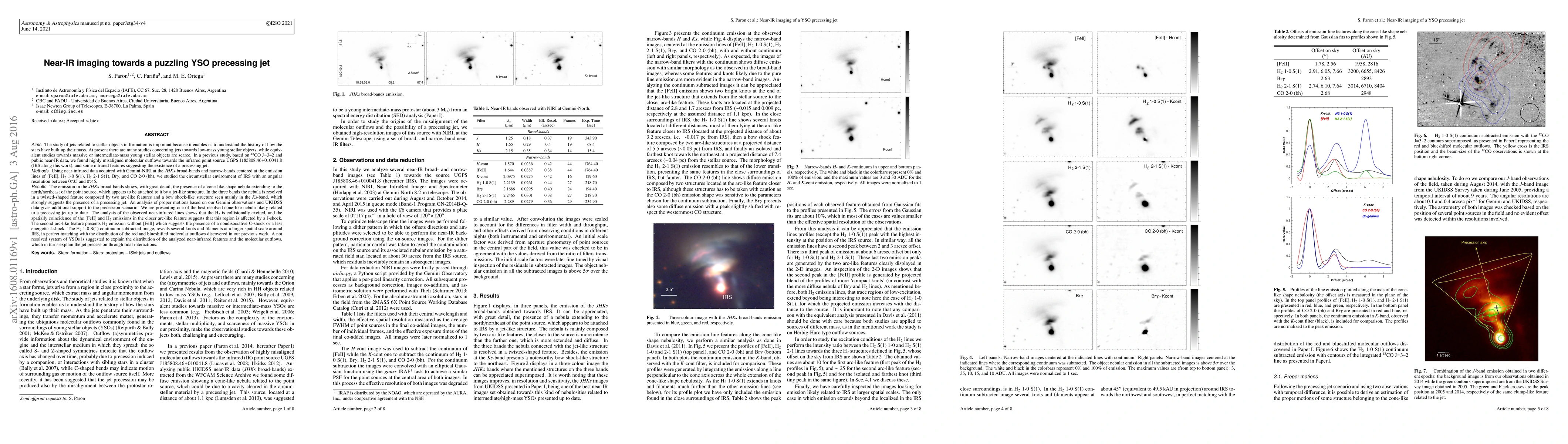 The study utilizes near-IR imaging with Gemini-NIRI to examine a precessing jet around a massive young stellar object (YSO), IRS. It reveals a twisted cone-like nebula, showing collisionally excited H2 and [FeII] emissions indicative of J-shocks and C-shocks, respectively. Proper motion analysis supports the precession hypothesis, presenting one of the best-resolved cone-like nebulae linked to a precessing jet to date.