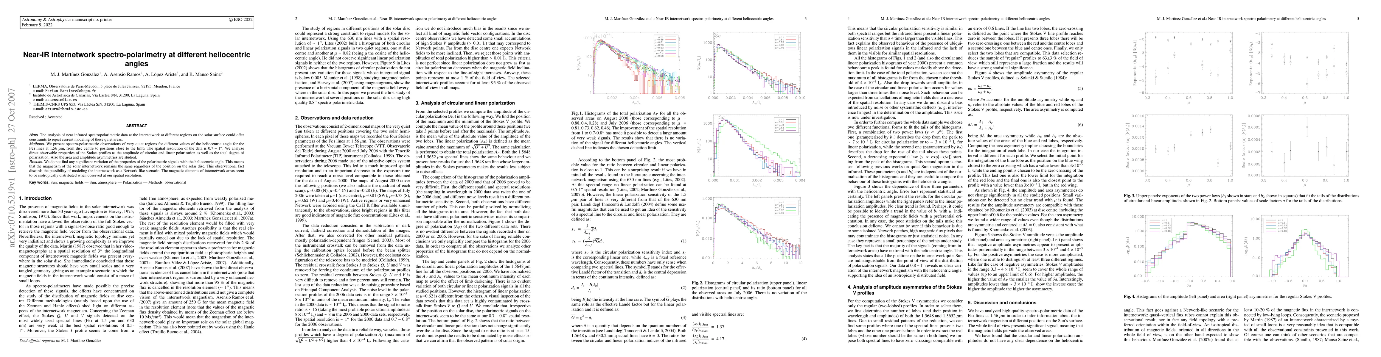 The analysis of near infrared spectropolarimetric data at the internetwork at different regions on the solar surface could offer constraints to reject current modeling of these quiet areas. We present spectro-polarimetric observations of very quiet regions for different values of the heliocentric angle for the Fe I lines at 1.56 micron, from disc centre to positions close to the limb. The spatial resolution of the data is 0.7-1". We analyze direct observable properties of the Stokes profiles as the amplitude of circular and linear polarization as well as the total degree of polarization. Also the area and amplitude asymmetries are studied. We do not find any significant variation of the properties of the polarimetric signals with the heliocentric angle. This means that the magnetism of the solar internetwork remains the same regardless of the position on the solar disc. This observational fact discards the possibility of modeling the internetwork as a Network-like scenario. The magnetic elements of internetwork areas seem to be isotropically distributed when observed at our spatial resolution.