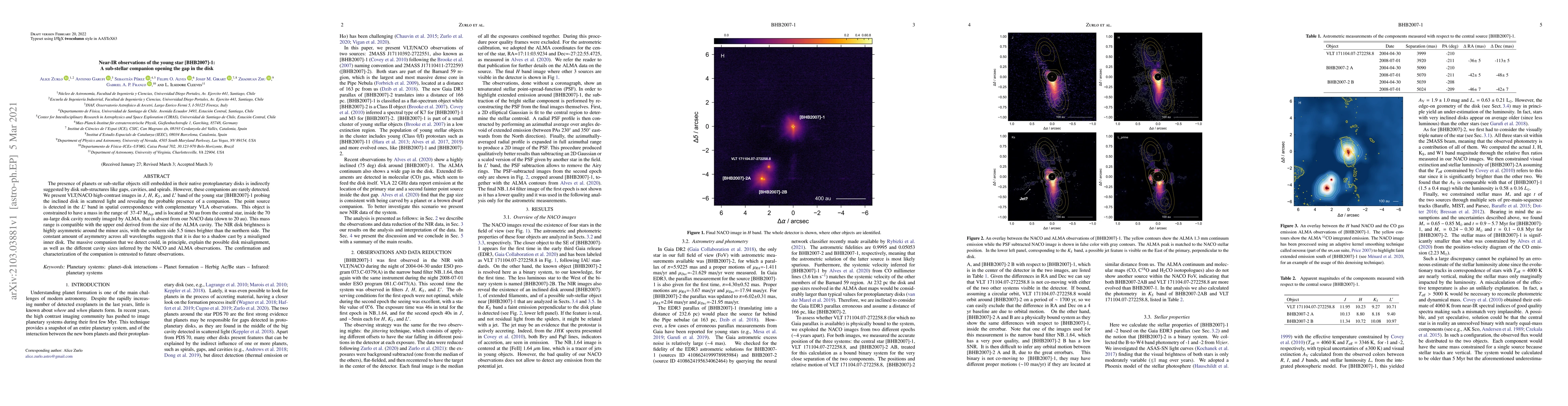 The presence of planets or sub-stellar objects still embedded in their native protoplanetary disks is indirectly suggested by disk sub-structures like gaps, cavities, and spirals. However, these companions are rarely detected. We present VLT/NACO high-contrast images in $J$, $H$, $K_S$, and $L^{\prime}$ band of the young star [BHB2007]-1 probing the inclined disk in scattered light and revealing the probable presence of a companion. The point source is detected in the $L^{\prime}$ band in spatial correspondence with complementary VLA observations. This object is constrained to have a mass in the range of 37-47 M$_{Jup}$ and is located at 50 au from the central star, inside the 70 au-large disk cavity recently imaged by ALMA, that is absent from our NACO data (down to 20 au). This mass range is compatible with the upper end derived from the size of the ALMA cavity. The NIR disk brightness is highly asymmetric around the minor axis, with the southern side 5.5 times brighter than the northern side. The constant amount of asymmetry across all wavelengths suggests that it is due to a shadow cast by a misaligned inner disk. The massive companion that we detect could, in principle, explain the possible disk misalignment, as well as the different cavity sizes inferred by the NACO and ALMA observations. The confirmation and characterization of the companion is entrusted to future observations.