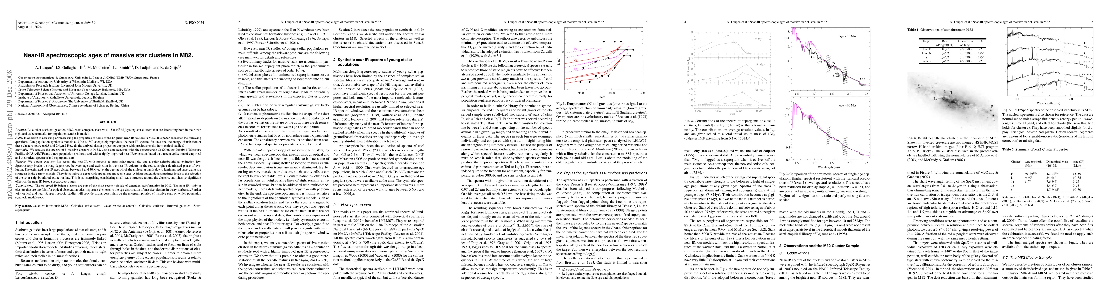 Like other starburst galaxies, M82 hosts compact, massive young star clusters that are interesting both in their own right and as benchmarks for population synthesis models. Can spectral synthesis models at resolutions around 1000 adequately reproduce the near-IR spectral features and the energy distribution of these clusters between 0.8 and 2.4 microns? How do the derived cluster properties compare with previous results from optical studies? We analyse the spectra of 5 massive clusters in M82, using data acquired with the spectrograph SpeX on the InfraRed Telescope Facility (NASA/IRTF) and a new population synthesis tool with a highly improved near-IR extension, based on a recent collection of empirical and theoretical spectra of red supergiant stars. We obtain excellent fits across the near-IR with models at quasi-solar metallicity and a solar neighbourhood extinction law. Spectroscopy breaks a strong degeneracy between age and extinction in the near-IR colours in the red supergiant-dominated phase of evolution. The estimated near-IR ages cluster between 9 and 30 Myr, i.e. the ages at which the molecular bands due to luminous red supergiants are strongest in the current models. They do not always agree with optical spectroscopic ages. Adding optical data sometimes leads to the rejection of the solar neighbourhood extinction law. This is not surprising considering small-scale structure around the clusters, but it has no significant effect on the near-IR based spectroscopic ages. [abridged]