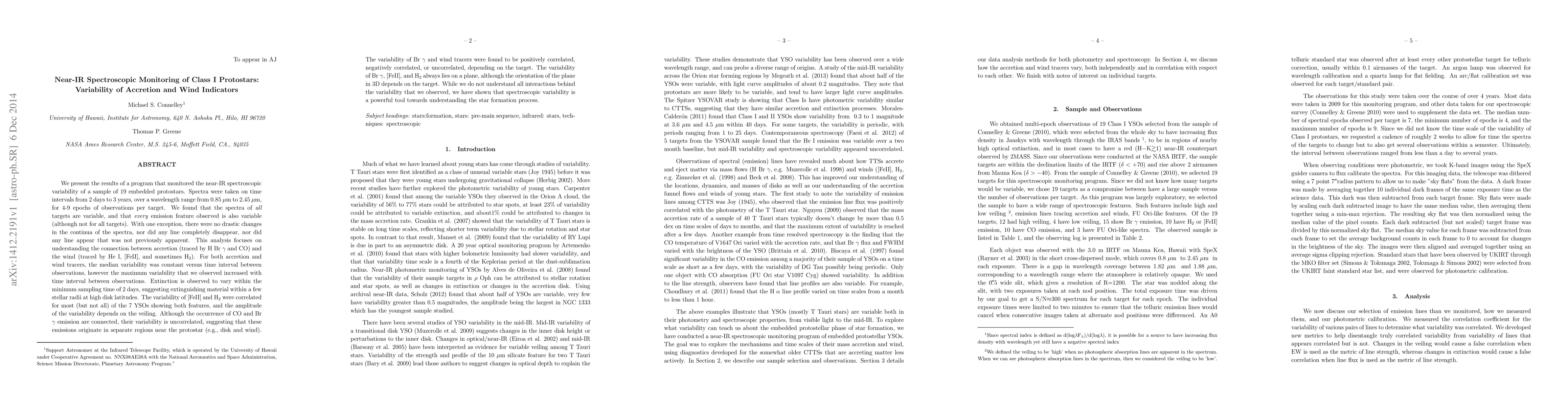 We present the results of a program that monitored the near-IR spectroscopic variability of a sample of 19 embedded protostars. Spectra were taken on time intervals from 2 days to 3 years, over a wavelength range from 0.85 {\mu}m to 2.45 {\mu}m, for 4-9 epochs of observations per target. We found that the spectra of all targets are variable, and that every emission feature observed is also variable (although not for all targets). With one exception, there were no drastic changes in the continua of the spectra, nor did any line completely disappear, nor did any line appear that was not previously apparent. This analysis focuses on understanding the connection between accretion (traced by H Br $\gamma$ and CO) and the wind (traced by He I, [FeII], and sometimes H$_2$). For both accretion and wind tracers, the median variability was constant versus time interval between observations, however the maximum variability that we observed increased with time interval between observations. Extinction is observed to vary within the minimum sampling time of 2 days, suggesting extinguishing material within a few stellar radii at high disk latitudes. The variability of [FeII] and H$_2$ were correlated for most (but not all) of the 7 YSOs showing both features, and the amplitude of the variability depends on the veiling. Although the occurrence of CO and Br $\gamma$ emission are connected, their variability is uncorrelated, suggesting that these emissions originate in separate regions near the protostar (e.g., disk and wind).