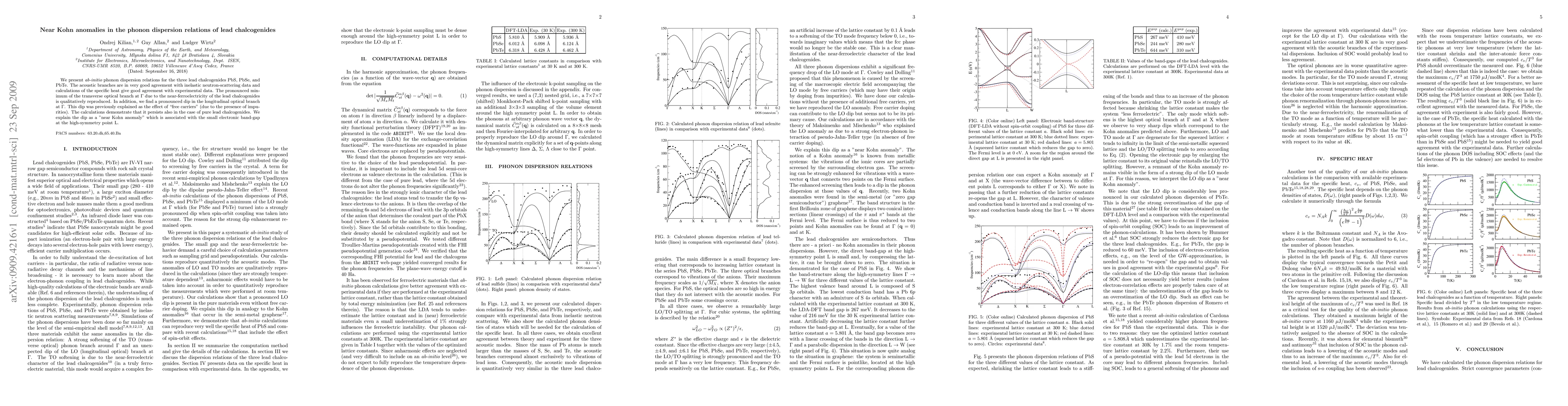We present ab-initio phonon dispersion relations for the three lead chalcogenides PbS, PbSe, and PbTe. The acoustic branches are in very good agreement with inelastic neutron-scattering data and calculations of the specific heat give good agreement with experimental data. The pronounced minimum of the transverse optical branch at Gamma due to the near-ferroelectricity of the lead chalcogenides is qualitatively reproduced. In addition, we find a pronounced dip in the longitudinal optical branch at Gamma. This dip was previously explained as the effect of "free carriers" (due to the presence of impurities). The calculations demonstrate that it persists also in the case of pure lead chalcogenides. We explain the dip as a "near Kohn anomaly" which is associated with the small electronic band-gap at the high-symmetry point L.