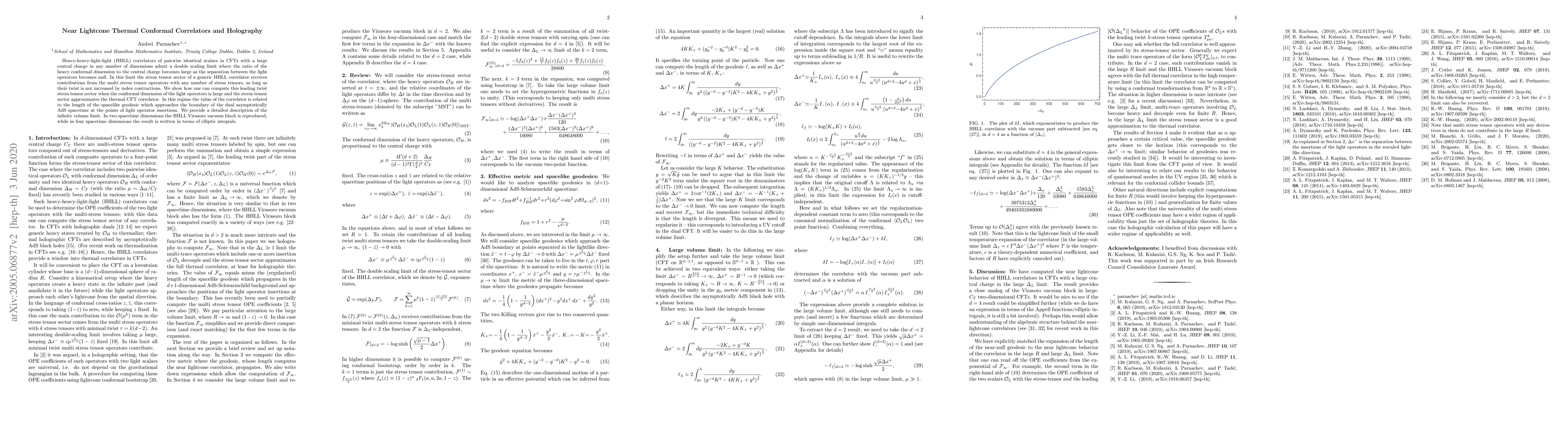 Heavy-heavy-light-light (HHLL) correlators of pairwise identical scalars in CFTs with a large central charge in any number of dimensions admit a double scaling limit where the ratio of the heavy conformal dimension to the central charge becomes large as the separation between the light operators becomes null. In this limit the stress tensor sector of a generic HHLL correlator receives contributions from the multi stress tensor operators with any number of stress tensors, as long as their twist is not increased by index contractions. We show how one can compute this leading twist stress tensor sector when the conformal dimension of the light operators is large and the stress tensor sector approximates the thermal CFT correlator. In this regime the value of the correlator is related to the length of the spacelike geodesic which approaches the boundary of the dual asymptotically AdS spacetime at the points of light operator insertions. We provide a detailed description of the infinite volume limit. In two spacetime dimensions the HHLL Virasoro vacuum block is reproduced, while in four spacetime dimensions the result is written in terms of elliptic integrals.