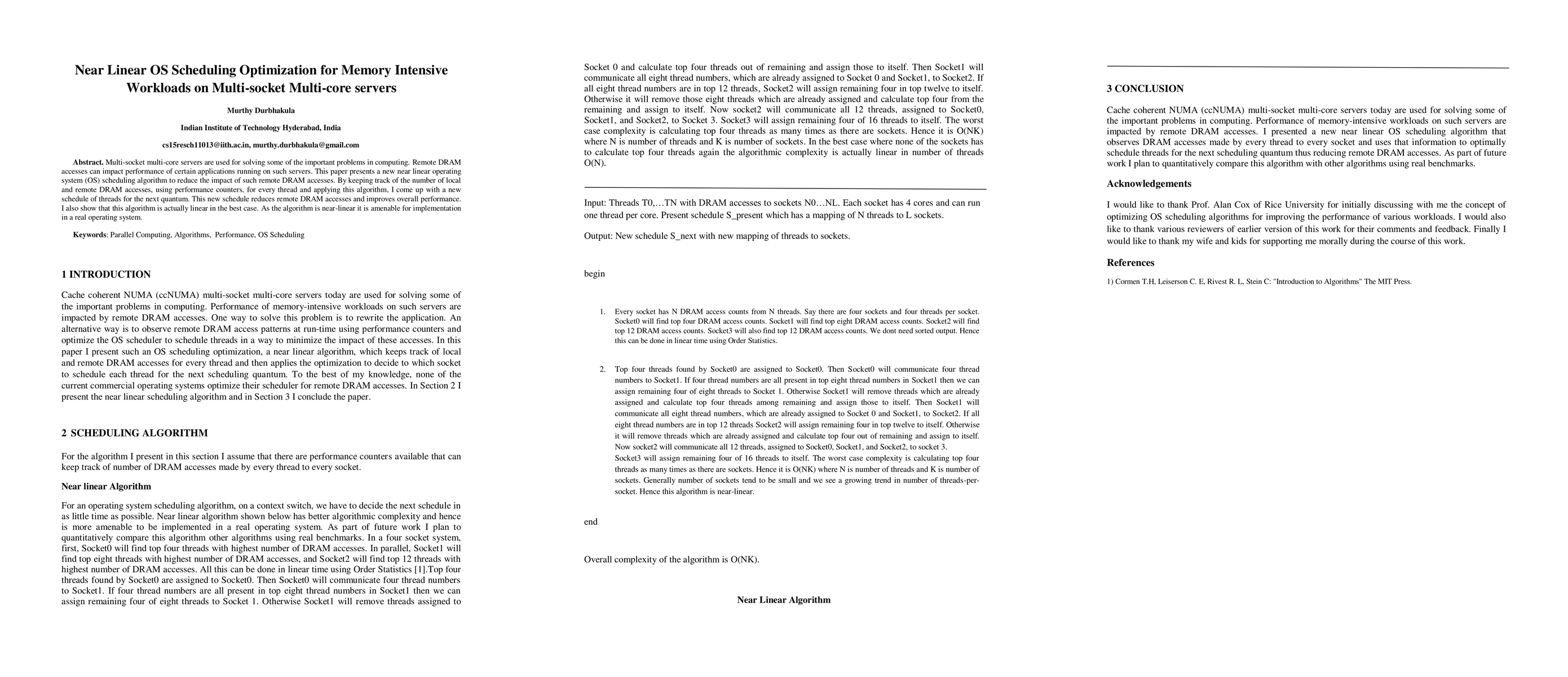 This paper introduces a near-linear OS scheduling algorithm designed to optimize performance for memory-intensive workloads on multi-socket multi-core servers by reducing remote DRAM accesses, thereby improving overall application performance. The algorithm leverages performance counters to track DRAM accesses and is shown to be linear in the best case, making it practical for real-time OS implementation.