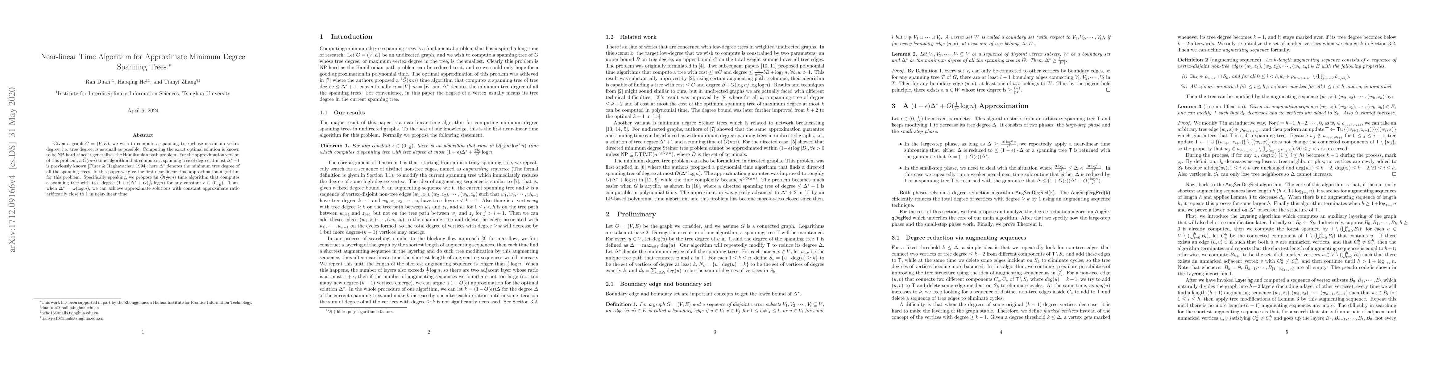 Given a graph $G = (V, E)$, we wish to compute a spanning tree whose maximum vertex degree, i.e. tree degree, is as small as possible. Computing the exact optimal solution is known to be NP-hard, since it generalizes the Hamiltonian path problem. For the approximation version of this problem, a $\tilde{O}(mn)$ time algorithm that computes a spanning tree of degree at most $\Delta^* +1$ is previously known [F\"urer \& Raghavachari 1994]; here $\Delta^*$ denotes the minimum tree degree of all the spanning trees. In this paper we give the first near-linear time approximation algorithm for this problem. Specifically speaking, we propose an $\tilde{O}(\frac{1}{\epsilon^7}m)$ time algorithm that computes a spanning tree with tree degree $(1+\epsilon)\Delta^* + O(\frac{1}{\epsilon^2}\log n)$ for any constant $\epsilon \in (0,\frac{1}{6})$. Thus, when $\Delta^*=\omega(\log n)$, we can achieve approximate solutions with constant approximate ratio arbitrarily close to 1 in near-linear time.