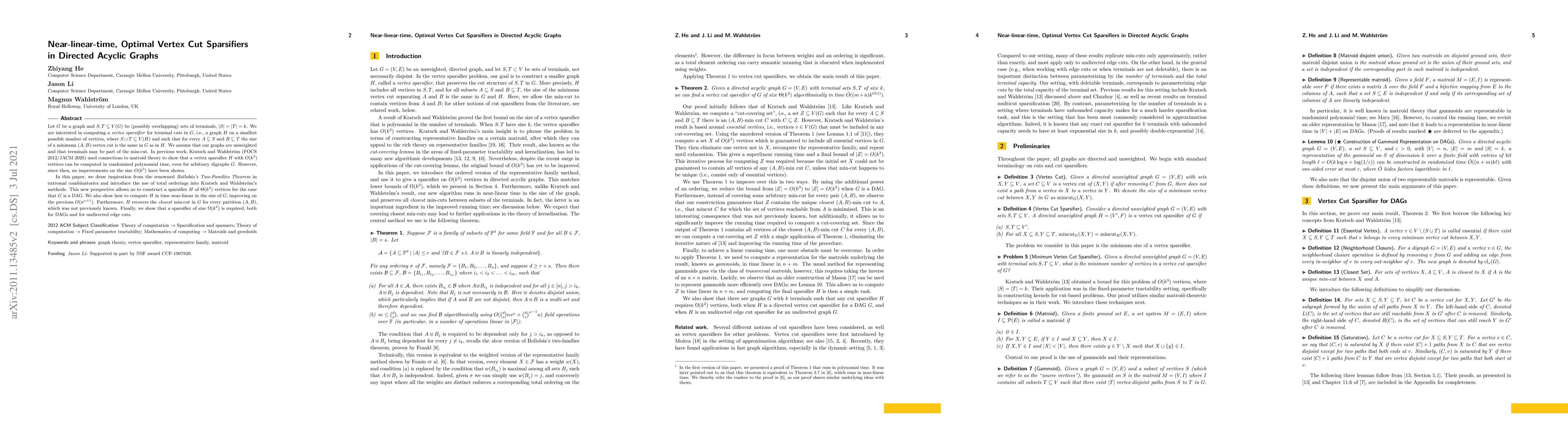 Let $G$ be a graph and $S, T \subseteq V(G)$ be (possibly overlapping) sets of terminals, $|S|=|T|=k$. We are interested in computing a vertex sparsifier for terminal cuts in $G$, i.e., a graph $H$ on a smallest possible number of vertices, where $S \cup T \subseteq V(H)$ and such that for every $A \subseteq S$ and $B \subseteq T$ the size of a minimum $(A,B)$-vertex cut is the same in $G$ as in $H$. We assume that our graphs are unweighted and that terminals may be part of the min-cut. In previous work, Kratsch and Wahlstr\"om (FOCS 2012/JACM 2020) used connections to matroid theory to show that a vertex sparsifier $H$ with $O(k^3)$ vertices can be computed in randomized polynomial time, even for arbitrary digraphs $G$. However, since then, no improvements on the size $O(k^3)$ have been shown. In this paper, we draw inspiration from the renowned Bollob\'as's Two-Families Theorem in extremal combinatorics and introduce the use of total orderings into Kratsch and Wahlstr\"om's methods. This new perspective allows us to construct a sparsifier $H$ of $\Theta(k^2)$ vertices for the case that $G$ is a DAG. We also show how to compute $H$ in time near-linear in the size of $G$, improving on the previous $O(n^{\omega+1})$. Furthermore, $H$ recovers the closest min-cut in $G$ for every partition $(A,B)$, which was not previously known. Finally, we show that a sparsifier of size $\Omega(k^2)$ is required, both for DAGs and for undirected edge cuts.