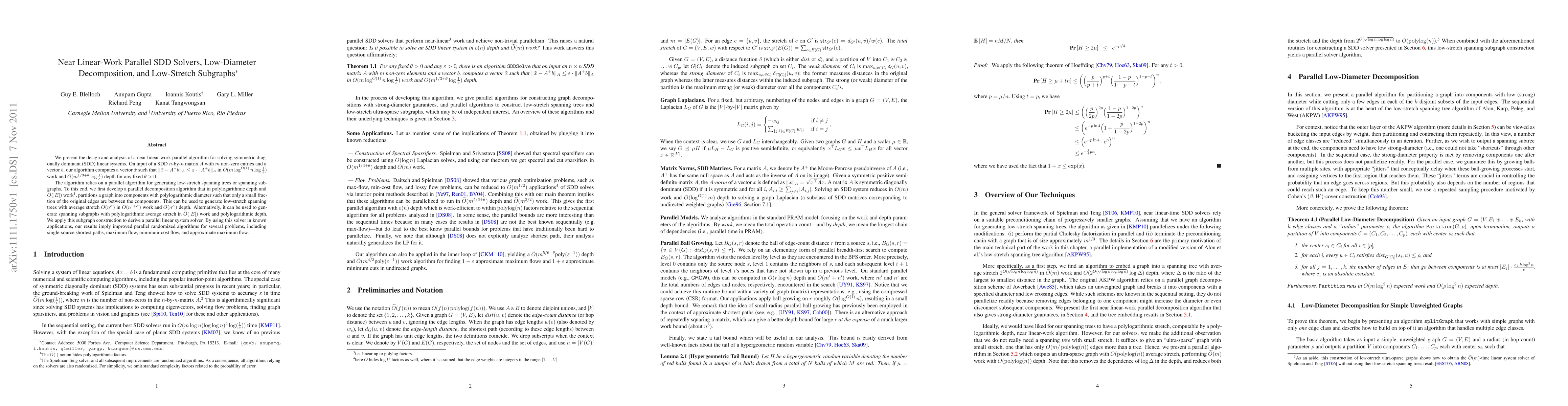 This paper presents a near linear-work parallel algorithm for solving symmetric diagonally dominant linear systems, achieving a solution within a specified error bound in polylogarithmic time. The algorithm leverages a parallel decomposition method to generate low-diameter subgraphs and low-stretch spanning trees, which are then used to improve parallel randomized algorithms for various problems including shortest paths and flow computations.