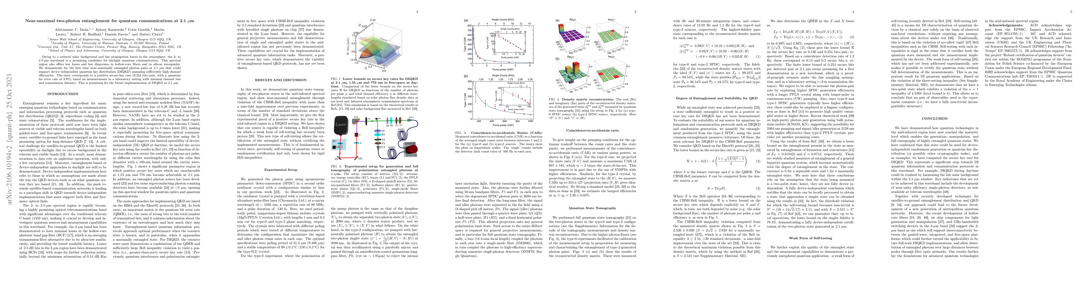 This paper demonstrates near-maximally entangled photon pairs at 2.1 µm, a spectral region ideal for daylight quantum communication due to low atmospheric losses. The achieved state supports device-independent quantum key distribution with a secure-key rate of 0.254 bits/pair, showing promise for future DIQKD implementations.