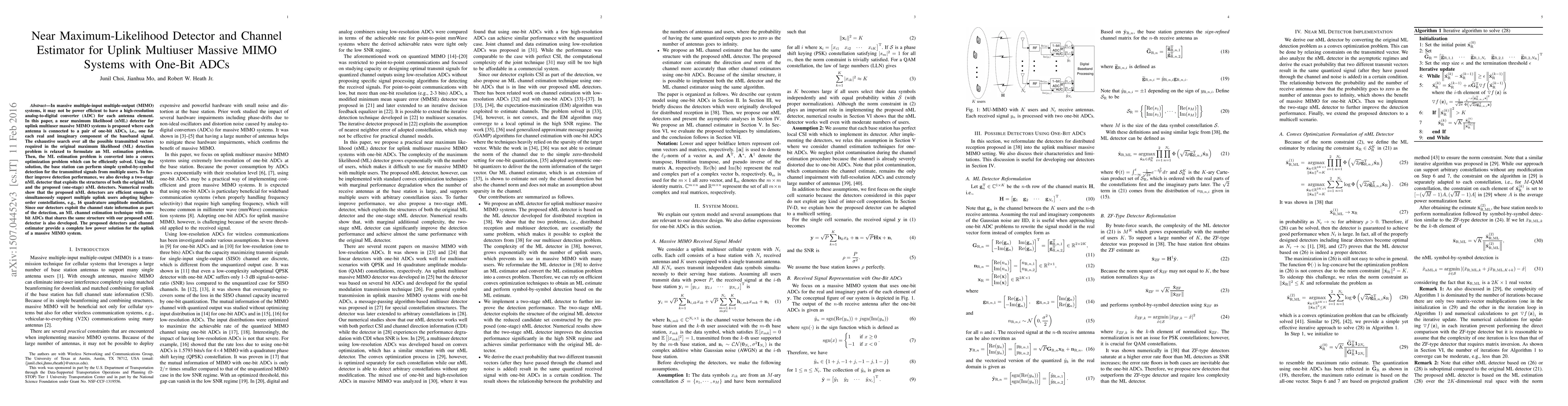 This paper proposes a near maximum likelihood (nML) detector and channel estimator for uplink multiuser massive MIMO systems using one-bit ADCs, which efficiently supports multiple users with higher-order modulations while maintaining low power consumption. The nML detector converts the original ML detection problem into a convex optimization problem, and a two-stage nML detector further enhances performance.
