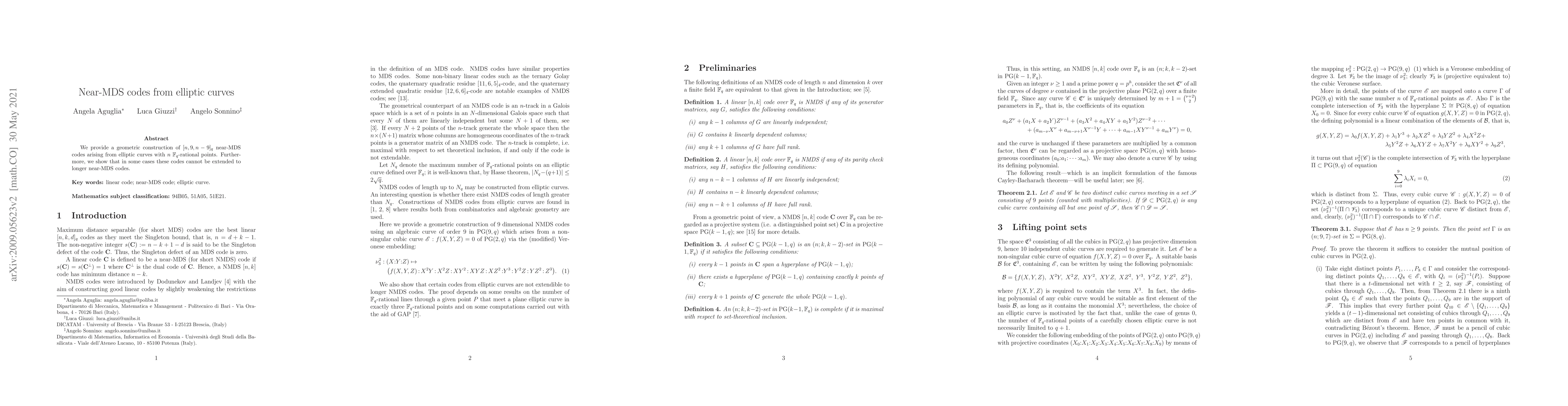 Summary: This paper introduces a novel construction of $[n,9,n-9]_q$ near-MDS codes derived from elliptic curves with $n$ ${\mathbb F}_q$-rational points, demonstrating that in certain cases, these codes cannot be extended to longer near-MDS codes.