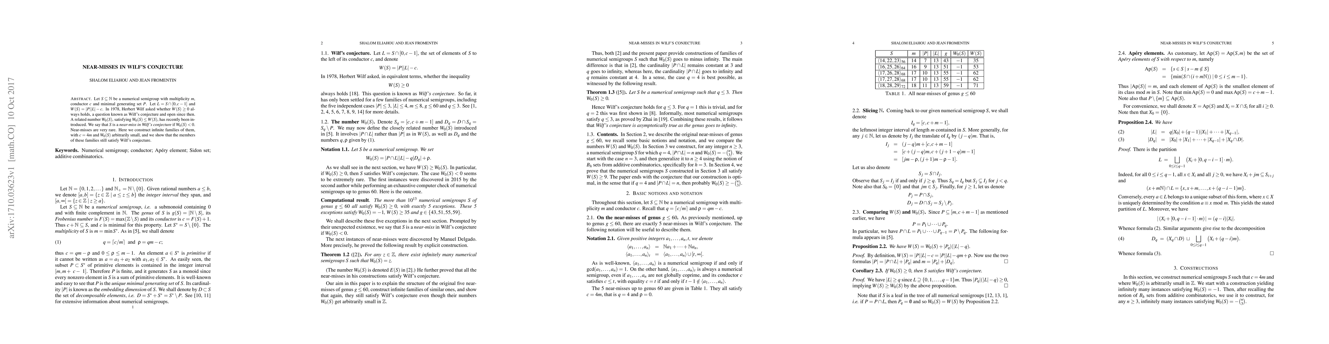 Let S $\subseteq$ N be a numerical semigroup with multiplicity m, conductor c and minimal generating set P. Let L = S $\cap$ [0, c -- 1] and W(S) = |P||L| -- c. In 1978, Herbert Wilf asked whether W(S) $\ge$ 0 always holds, a question known as Wilf's conjecture and open since then. A related number W0(S), satisfying W0(S) $\le$ W(S), has recently been introduced. We say that S is a near-miss in Wilf's conjecture if W0(S) < 0. Near-misses are very rare. Here we construct infinite families of them, with c = 4m and W0(S) arbitrarily small, and we show that the members of these families still satisfy Wilf's conjecture.