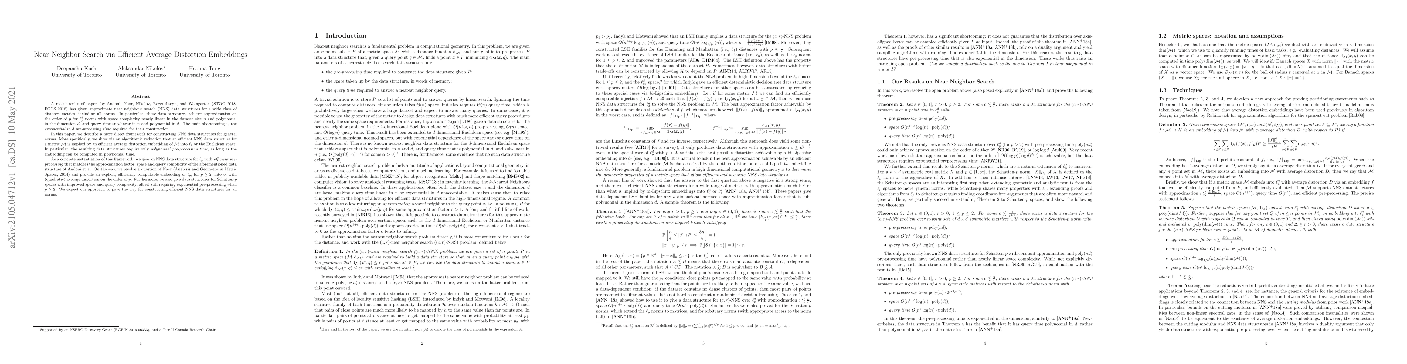 This paper introduces a new framework for constructing near neighbor search (NNS) data structures for general norms, resolving the exponential pre-processing time issue of previous methods. It achieves this by reducing NNS efficiency to average distortion embeddings into $ell_1$ or Euclidean space, with a concrete instantiation for $ell_p$ norms matching the approximation, space, and query complexity of prior work, while ensuring polynomial pre-processing time. Additionally, it provides an explicit embedding of $ell_p$ (for $p ge 2$) into $ell_2$ with quadratic average distortion on the order of $p$, addressing a question by Naor.