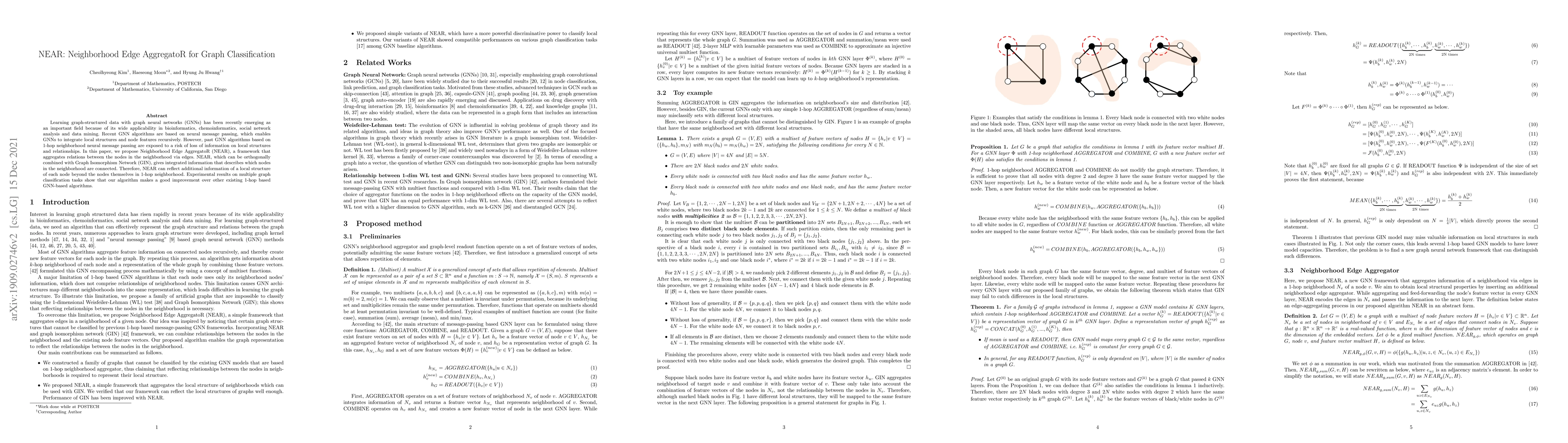 The NEAR framework aggregates relations between nodes in the neighborhood via edges to enhance local structure information in GNNs, improving graph classification performance over existing 1-hop based algorithms. Combined with GIN, NEAR provides additional context on node connections beyond immediate neighbors.