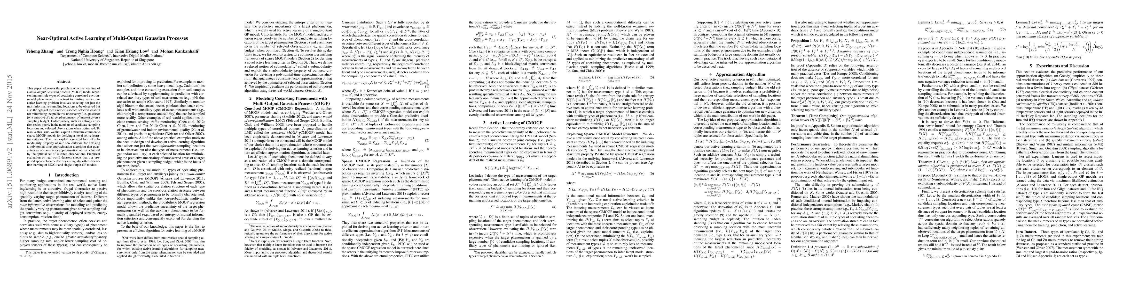This paper proposes an active learning method for multi-output Gaussian processes, optimizing both sampling locations and measurement types to minimize predictive uncertainty. It addresses scalability issues through a novel active learning criterion and a polynomial-time approximation algorithm, outperforming existing algorithms in empirical evaluations.