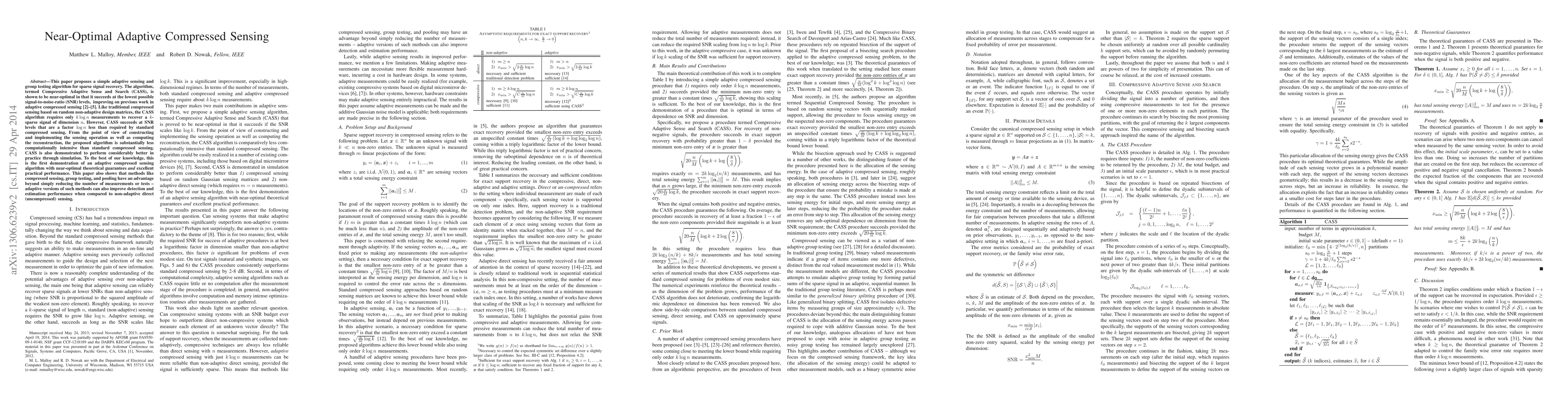 This paper introduces an adaptive sensing algorithm called Compressive Adaptive Sense and Search (CASS) for sparse signal recovery, which achieves near-optimal performance at lower signal-to-noise ratios compared to traditional compressed sensing methods. CASS requires fewer measurements and is less computationally intensive, demonstrating superior practical performance through simulations.