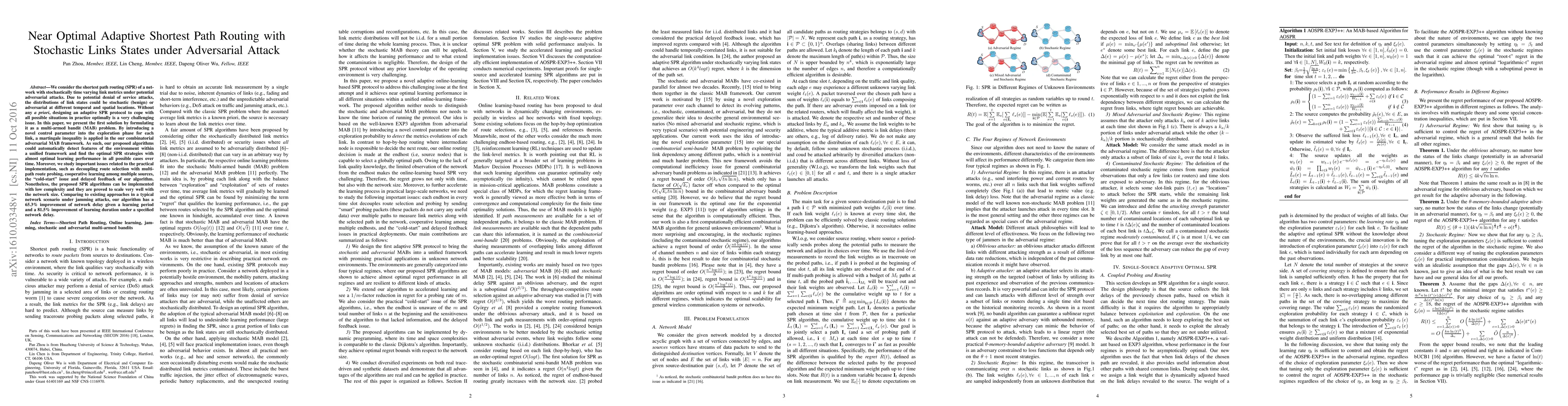 We consider the shortest path routing (SPR) of a network with stochastically time varying link metrics under potential adversarial attacks. Due to potential denial of service attacks, the distributions of link states could be stochastic (benign) or adversarial at different temporal and spatial locations. Without any \emph{a priori}, designing an adaptive SPR protocol to cope with all possible situations in practice optimally is a very challenging issue. In this paper, we present the first solution by formulating it as a multi-armed bandit (MAB) problem. By introducing a novel control parameter into the exploration phase for each link, a martingale inequality is applied in the our combinatorial adversarial MAB framework. As such, our proposed algorithms could automatically detect features of the environment within a unified framework and find the optimal SPR strategies with almost optimal learning performance in all possible cases over time. Moreover, we study important issues related to the practical implementation, such as decoupling route selection with multi-path route probing, cooperative learning among multiple sources, the "cold-start" issue and delayed feedback of our algorithm. Nonetheless, the proposed SPR algorithms can be implemented with low complexity and they are proved to scale very well with the network size. Comparing to existing approaches in a typical network scenario under jamming attacks, our algorithm has a 65.3\% improvement of network delay given a learning period and a 81.5\% improvement of learning duration under a specified network delay.