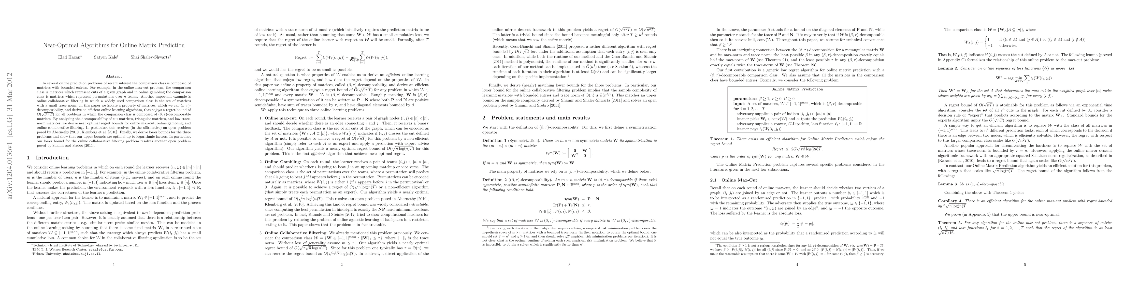 This paper presents an efficient online learning algorithm for matrix prediction problems with bounded entries, achieving near-optimal regret bounds of O*(sqrt(beta tau T)) for (beta,tau)-decomposable matrices. It resolves open problems in online max-cut, gambling, and collaborative filtering, deriving tight upper and lower bounds for these problems.