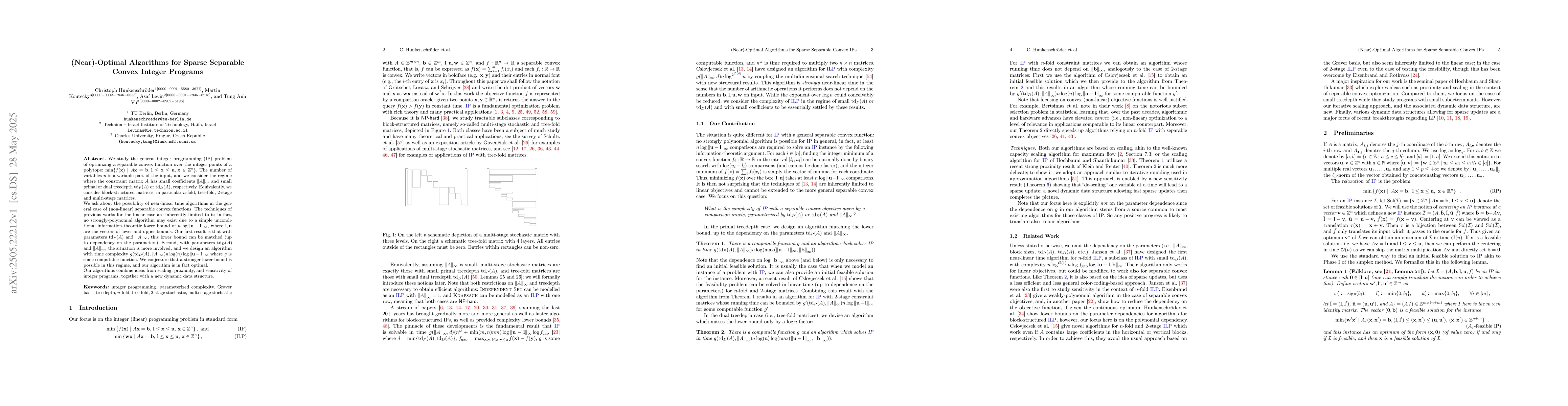 The paper studies (near)-optimal algorithms for sparse separable convex integer programs, focusing on block-structured matrices with small coefficients and treedepth, combining scaling, proximity, sensitivity, and dynamic data structures.