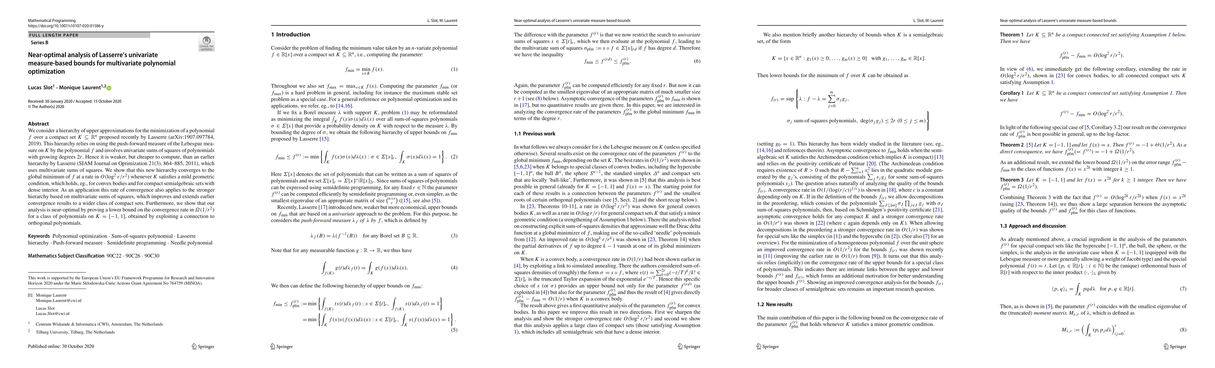 This paper analyzes a new hierarchy proposed by Lasserre for minimizing multivariate polynomials, showing it converges to the global minimum at a rate of $O(\log^2 r / r^2)$ under mild geometric conditions. The analysis also proves a lower bound of $\Omega(1/r^2)$, demonstrating near-optimality of the convergence rate.