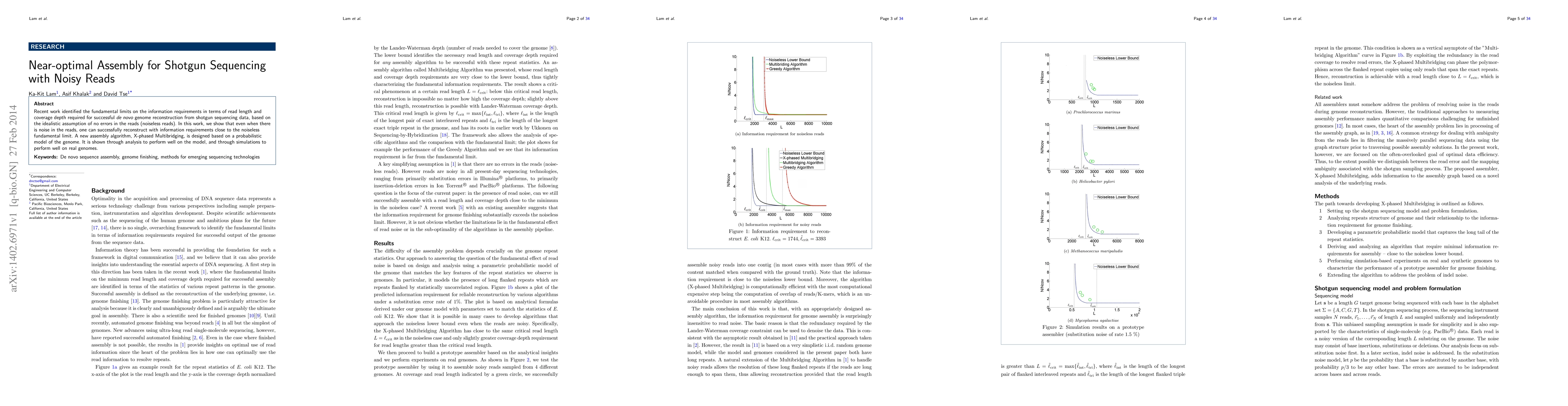 This paper introduces a new assembly algorithm, X-phased Multibridging, designed to reconstruct genomes from shotgun sequencing with noisy reads. It demonstrates that the algorithm can achieve near-optimal assembly performance close to the theoretical limit, even when reads contain errors, through both theoretical analysis and real-genome simulations.