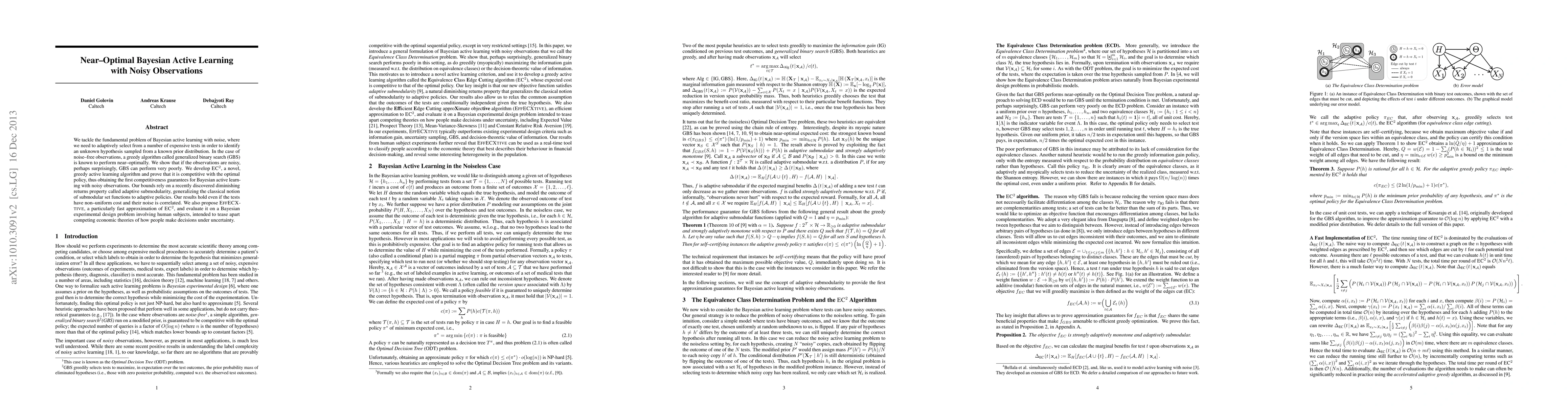 We tackle the fundamental problem of Bayesian active learning with noise, where we need to adaptively select from a number of expensive tests in order to identify an unknown hypothesis sampled from a known prior distribution. In the case of noise-free observations, a greedy algorithm called generalized binary search (GBS) is known to perform near-optimally. We show that if the observations are noisy, perhaps surprisingly, GBS can perform very poorly. We develop EC2, a novel, greedy active learning algorithm and prove that it is competitive with the optimal policy, thus obtaining the first competitiveness guarantees for Bayesian active learning with noisy observations. Our bounds rely on a recently discovered diminishing returns property called adaptive submodularity, generalizing the classical notion of submodular set functions to adaptive policies. Our results hold even if the tests have non-uniform cost and their noise is correlated. We also propose EffECXtive, a particularly fast approximation of EC2, and evaluate it on a Bayesian experimental design problem involving human subjects, intended to tease apart competing economic theories of how people make decisions under uncertainty.